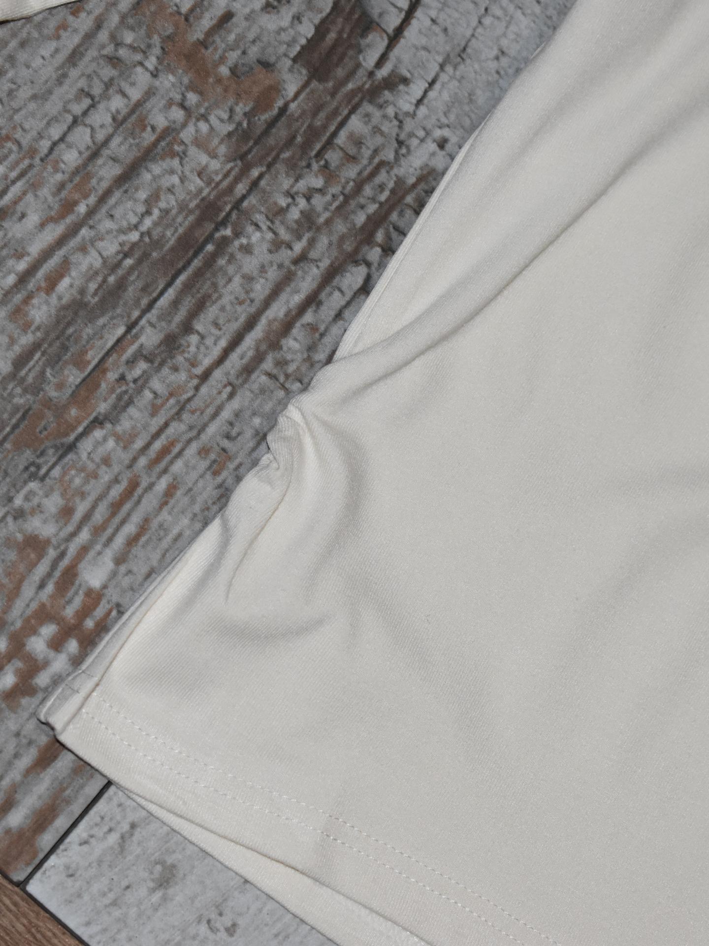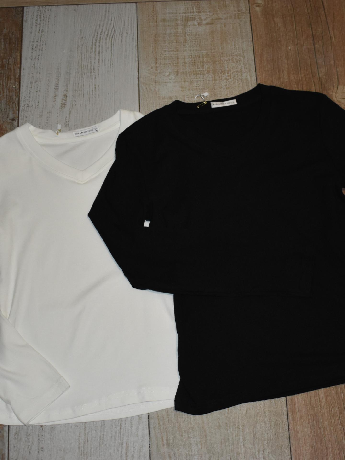 Un básico con carácter: camiseta de manga larga en algodón elástico, con escote en pico y detalle fruncido en los laterales. Disponible en beige, kaki, blanco y negro.
