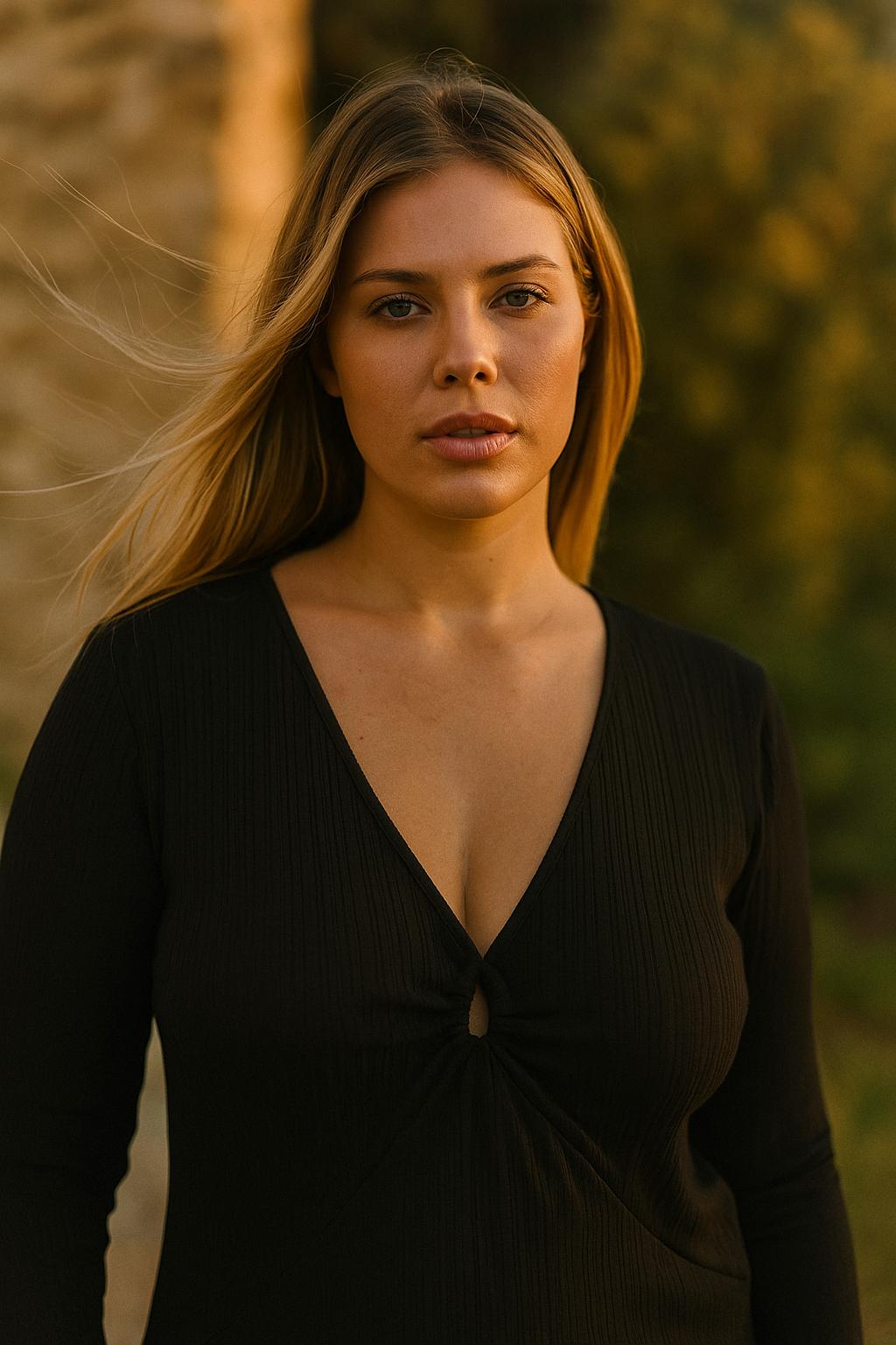 Su escote en pico estilizador incorpora un delicado adorno dorado que aporta un toque chic, acompañado de una abertura central que realza el diseño y lo convierte en un imprescindible para looks casuales o más arreglados.