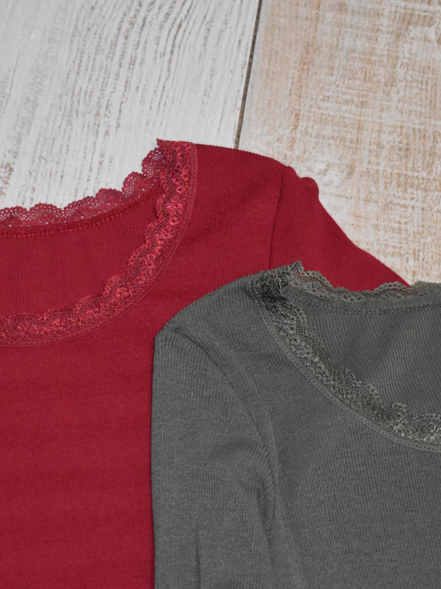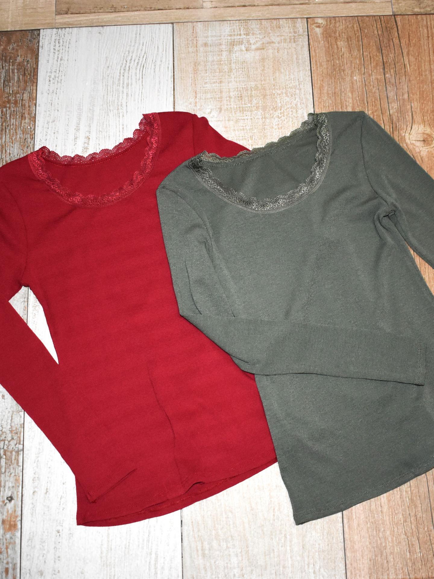 La camiseta que combina comodidad y feminidad. Manga larga, elástica y con un delicado detalle de encaje en el escote. Disponible en verde, rojo, granate y negro.
