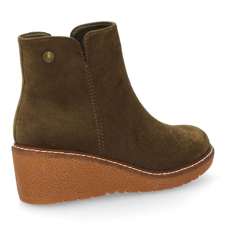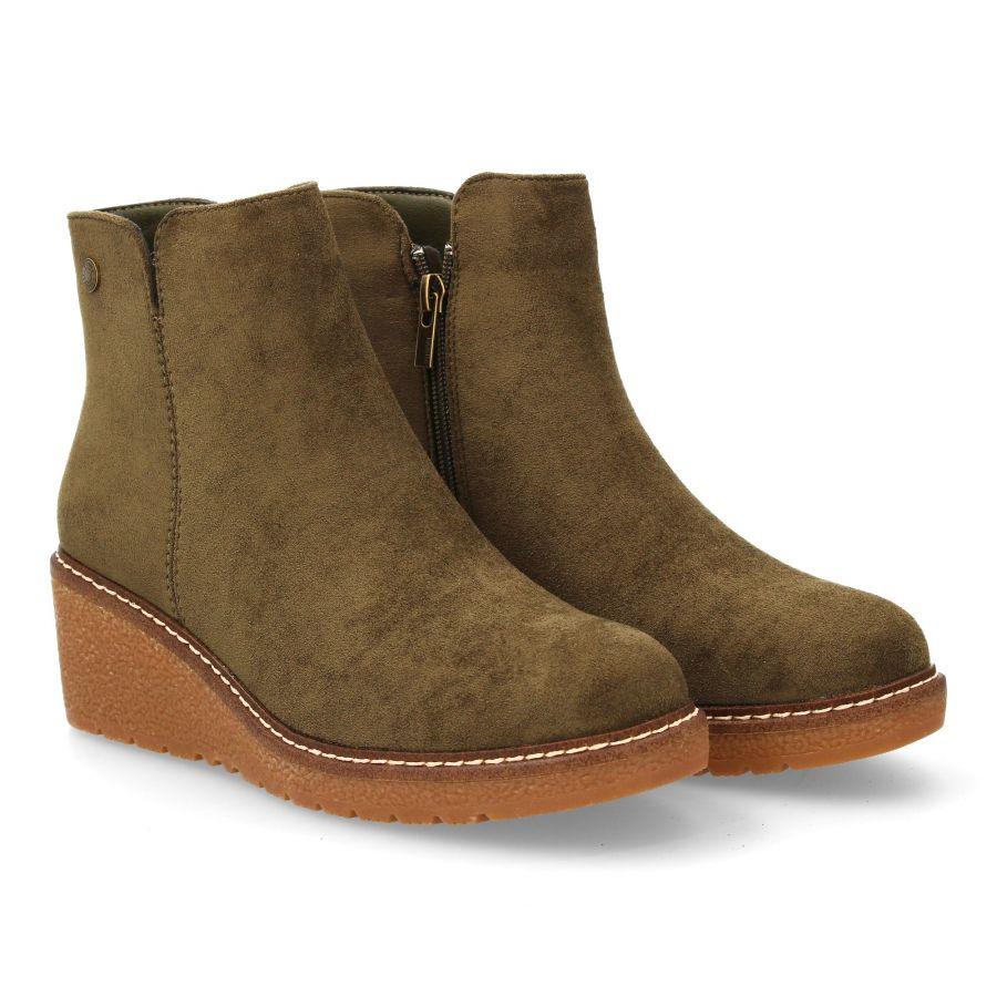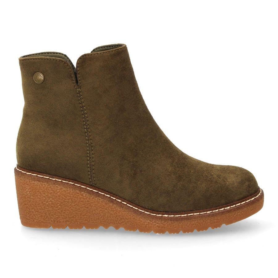Botín verde kaki en ante con cuña interior y cremallera lateral. Elegancia cómoda para tus looks diarios.