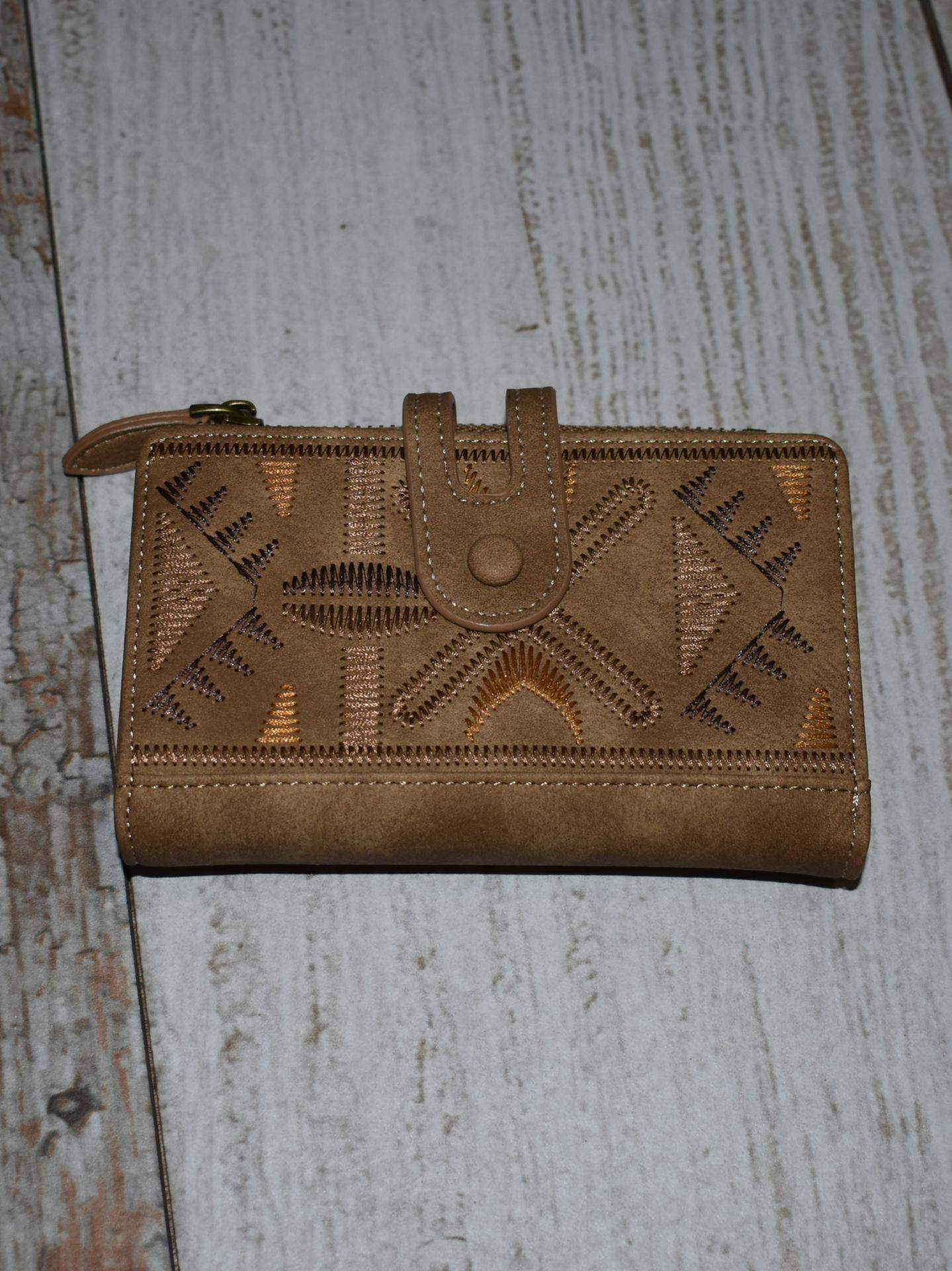 Un monedero que combina diseño artesanal y funcionalidad real. Bordado de hojas, gran capacidad y colores cálidos: beige, camel y verde.