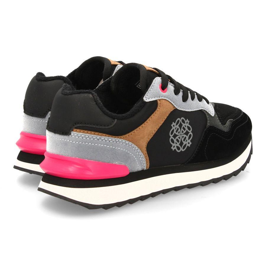 Deportivos de mujer estilo retro running, disponibles en negro con detalles fucsia y gris o en azul/beige multicolor. Ligeras, cómodas y con suela antideslizante para uso diario.
