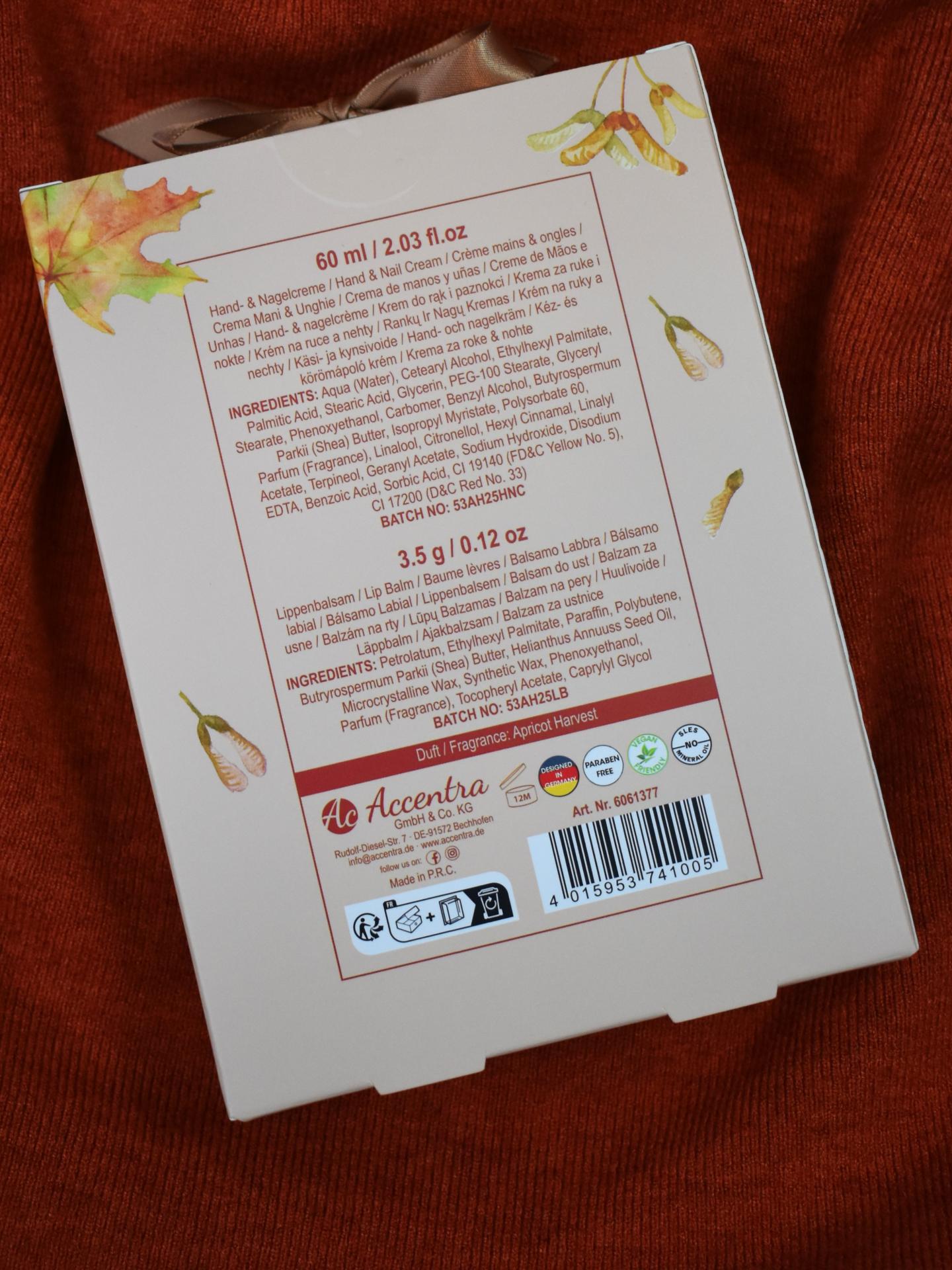 Pack de crema de manos y labial de karité Accentra, con aroma a albaricoque, 100% vegano, sin parabenos ni aceites minerales. Ideal para regalar o mimarte este otoño.