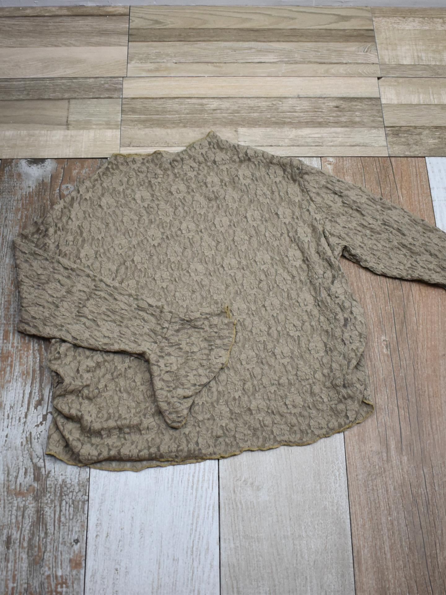 Camiseta de manga larga y tejido íntegro de encaje, diseñada especialmente para tallas curvy. Con detalle de volante en las mangas y fruncidos laterales que estilizan la figura. Disponible en marrón, beige y negro.