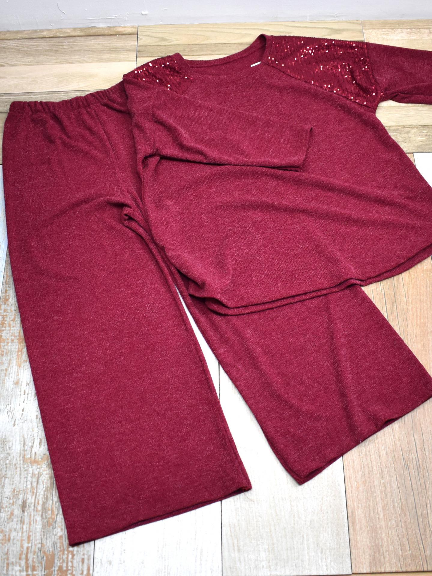Conjunto curvy de punto con jersey de cuello redondo y lentejuelas en los hombros, acompañado de pantalón de punto con cintura elástica y corte recto. Disponible en negro, marrón, burdeos y rojo.