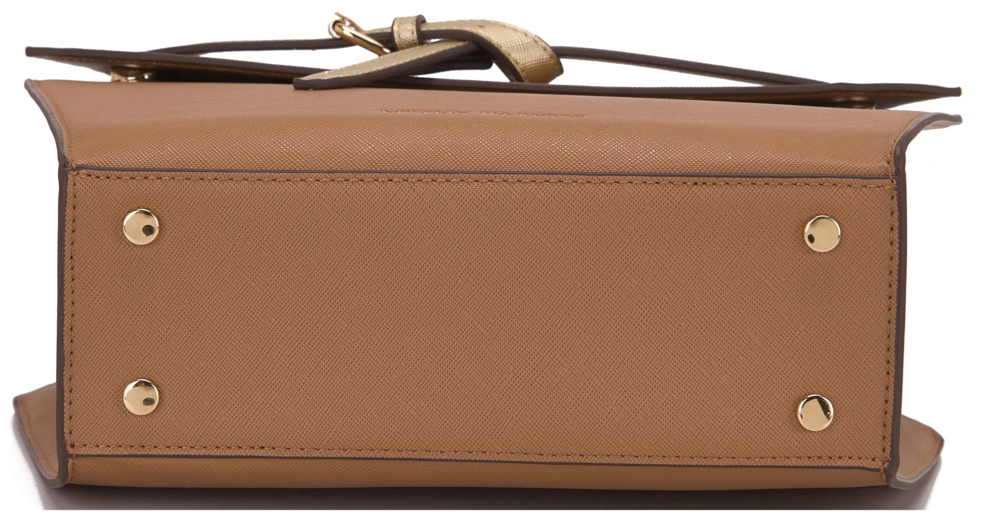 El tono toffee/camel aporta calidez y elegancia, mientras que el cierre frontal tipo cinturón en contraste beige añade un detalle distintivo que refuerza su estética premium. Su estructura rígida garantiza que el bolso mantenga su forma impecable incluso con uso diario.