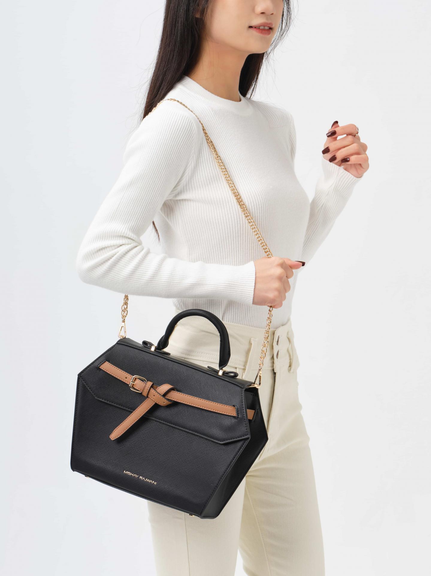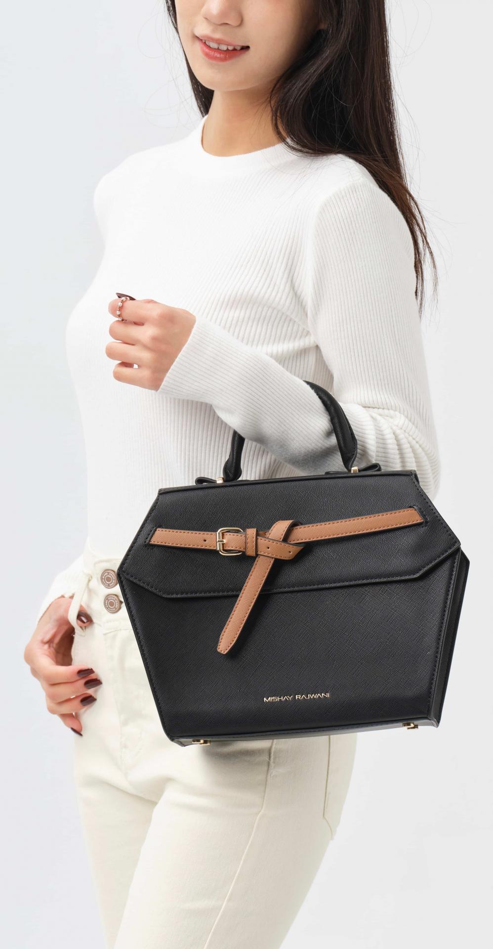 El acabado en negro profundo se combina con un cierre frontal tipo cinturón en tono cuero, creando un contraste sutil que eleva su estética y refuerza su carácter premium. Gracias a su estructura rígida, el bolso mantiene su forma impecable incluso con uso diario.
