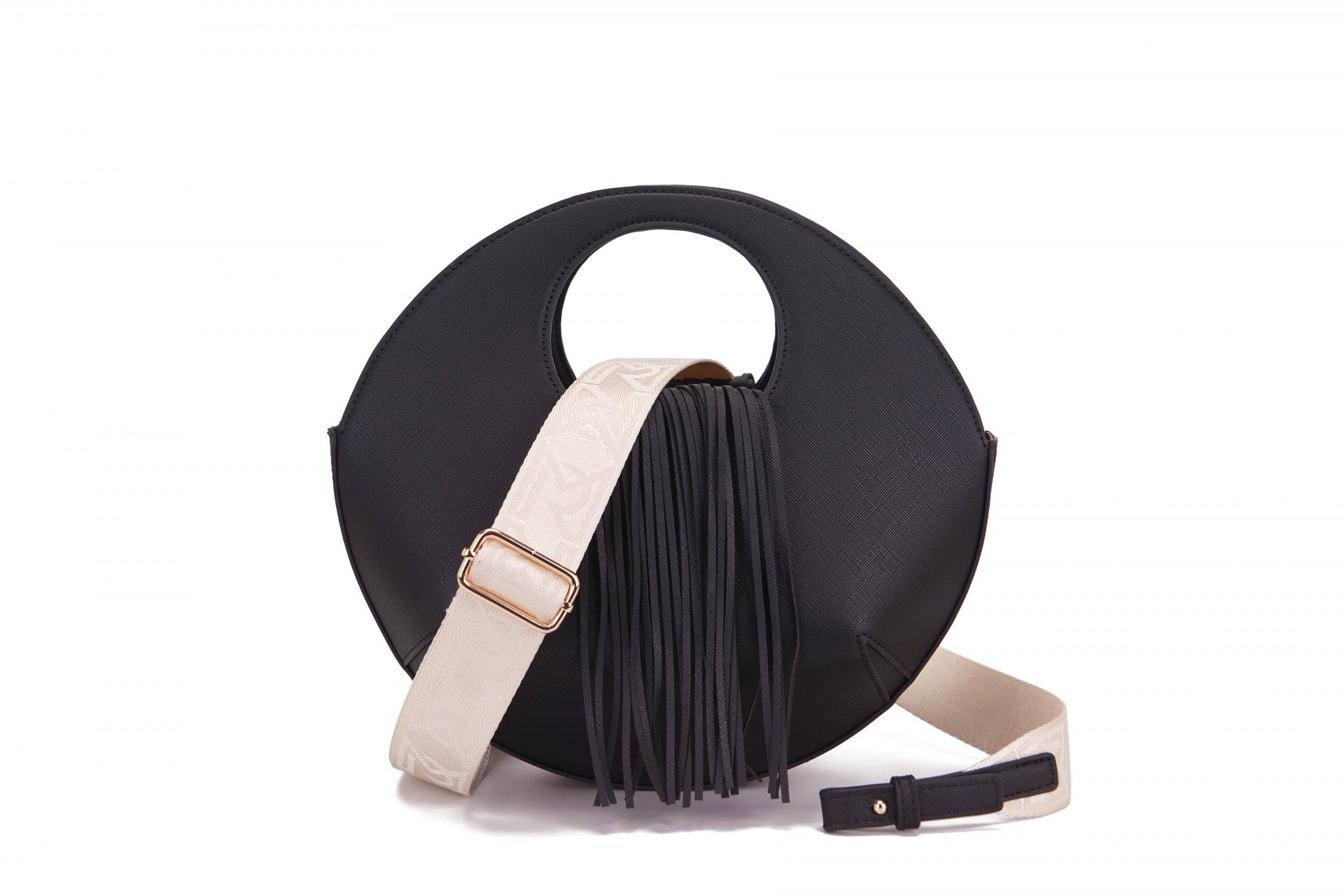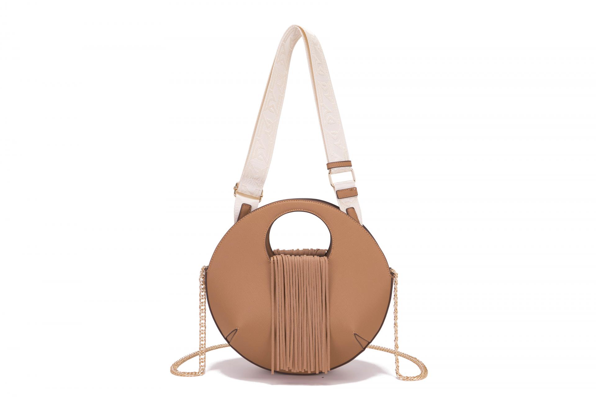 Bolso redondo de diseño con flecos frontales y asa circular. Disponible en color camel y negro. Elegante, moderno y exclusivo de Complementos E&E.