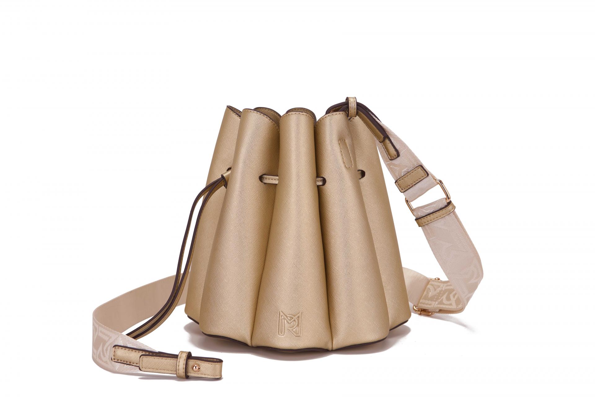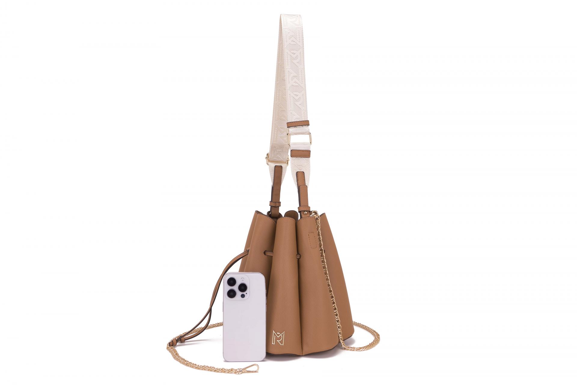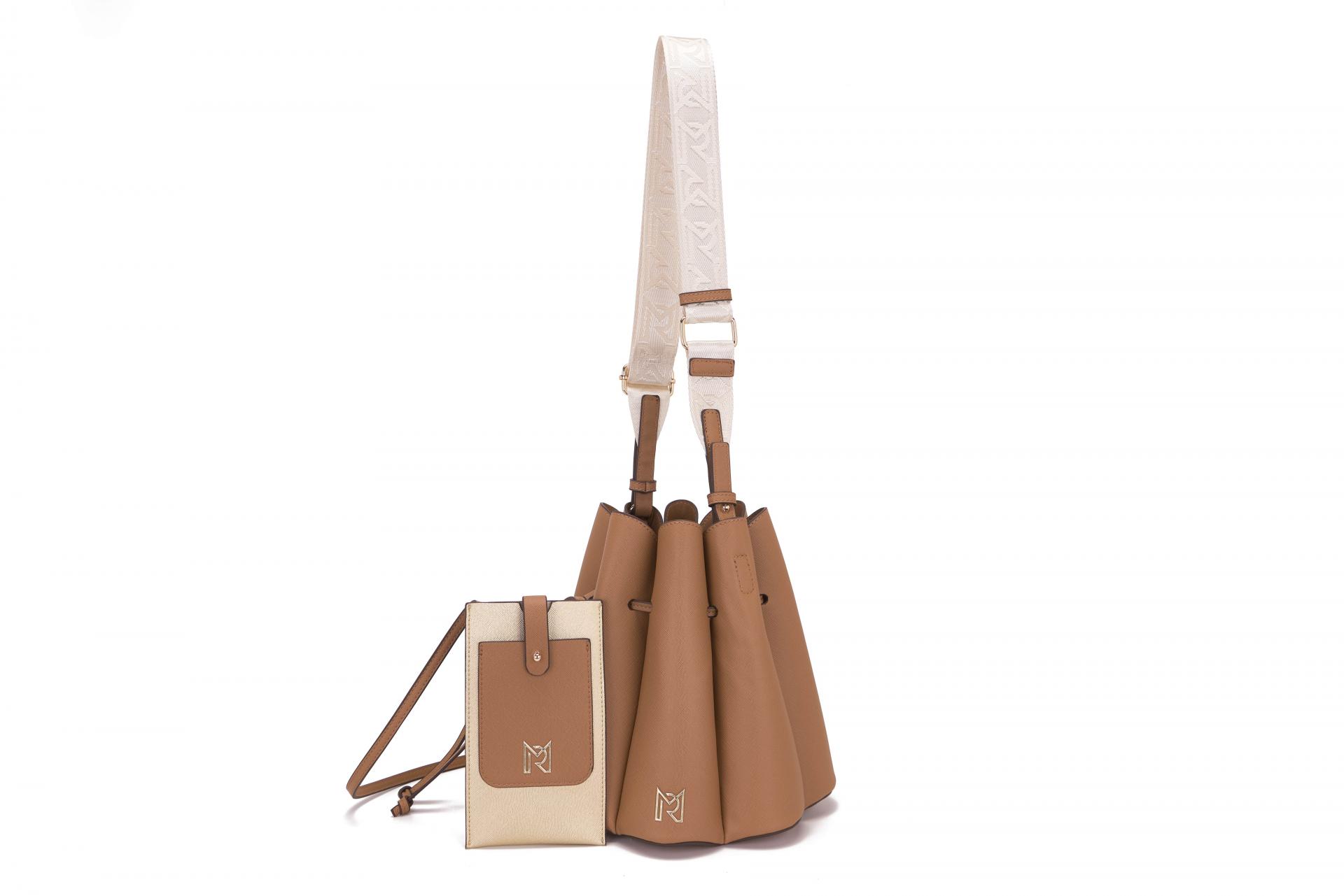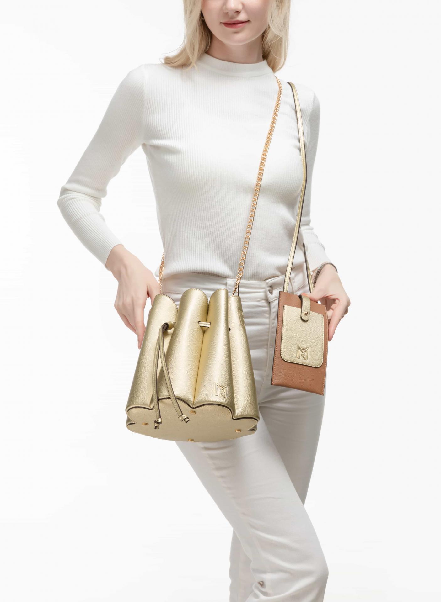 Bolso tipo bucket en tono dorado/camel con diseño plisado y correa ancha. Incluye funda para móvil a juego. Elegante, práctico y exclusivo de E&E.