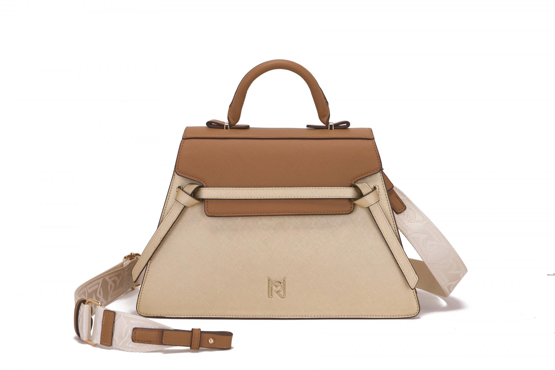 Bolso estructurado con diseño geométrico y asa superior. Disponible en camel degradado y blanco. Elegante, sofisticado y exclusivo de E&E.