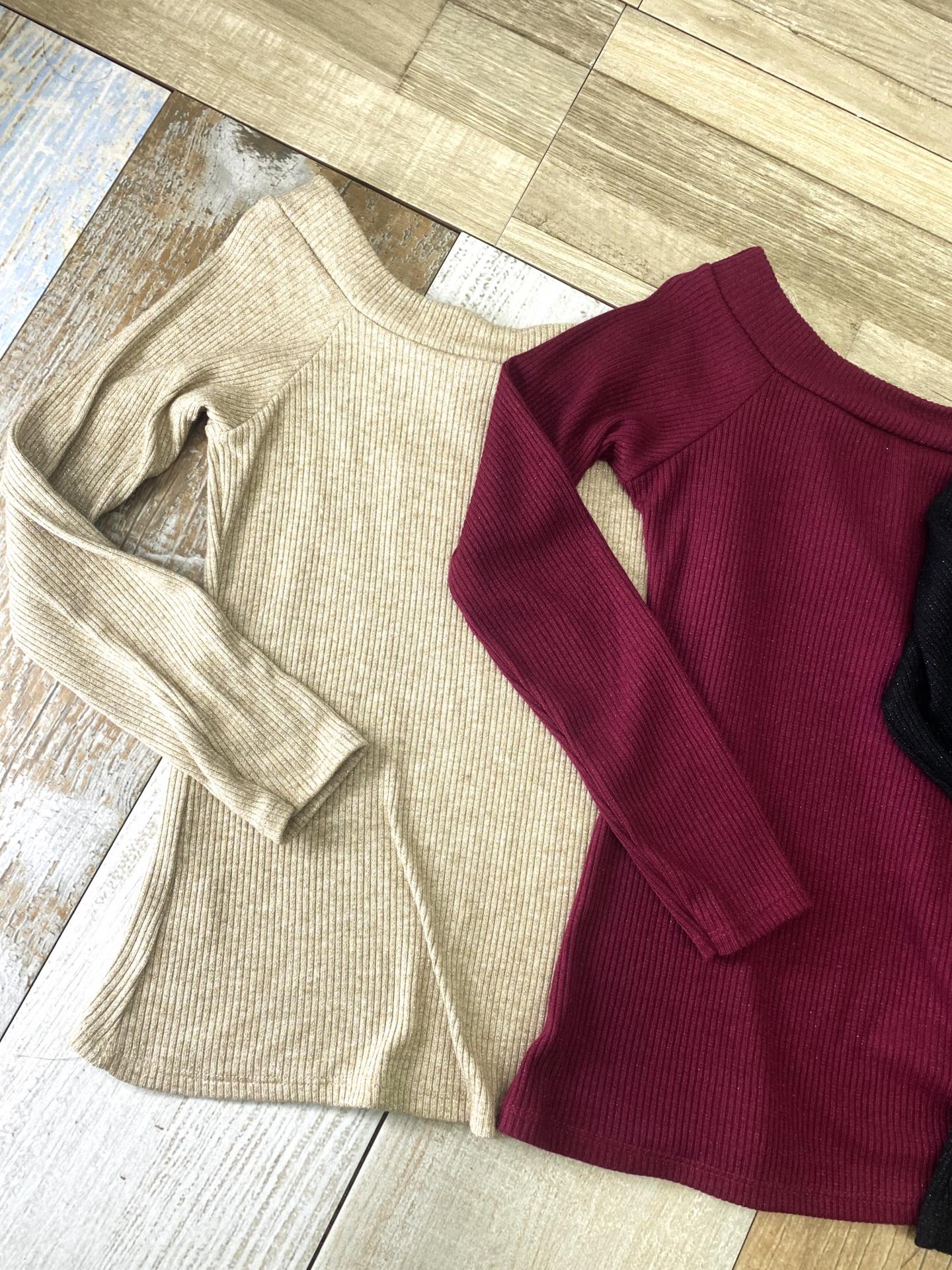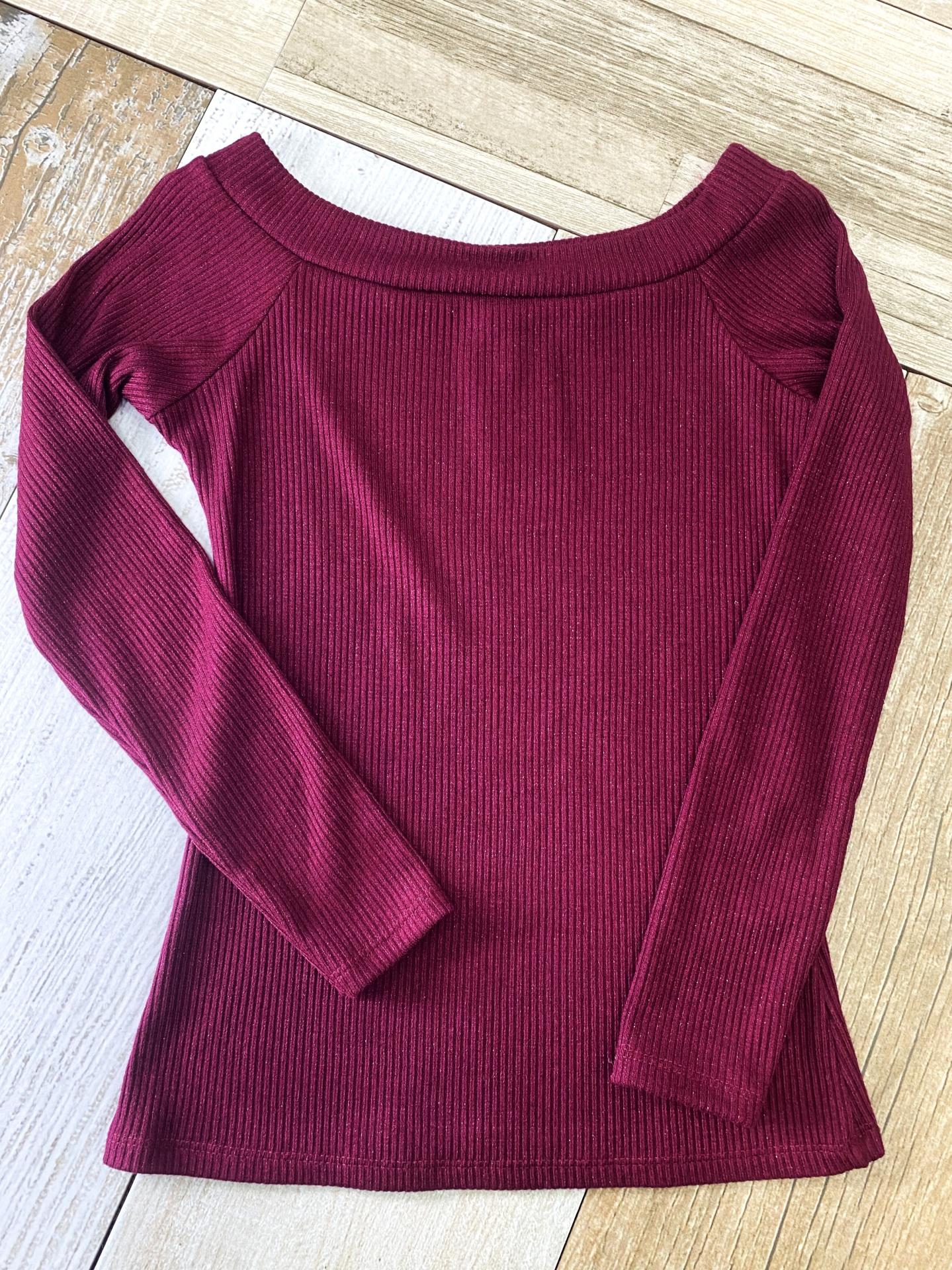 Camiseta de manga larga con cuello barco, cómoda y elástica, con un ligero brillo que eleva cualquier look. Talla única adaptable. Disponible en burdeos, beige y negro.
