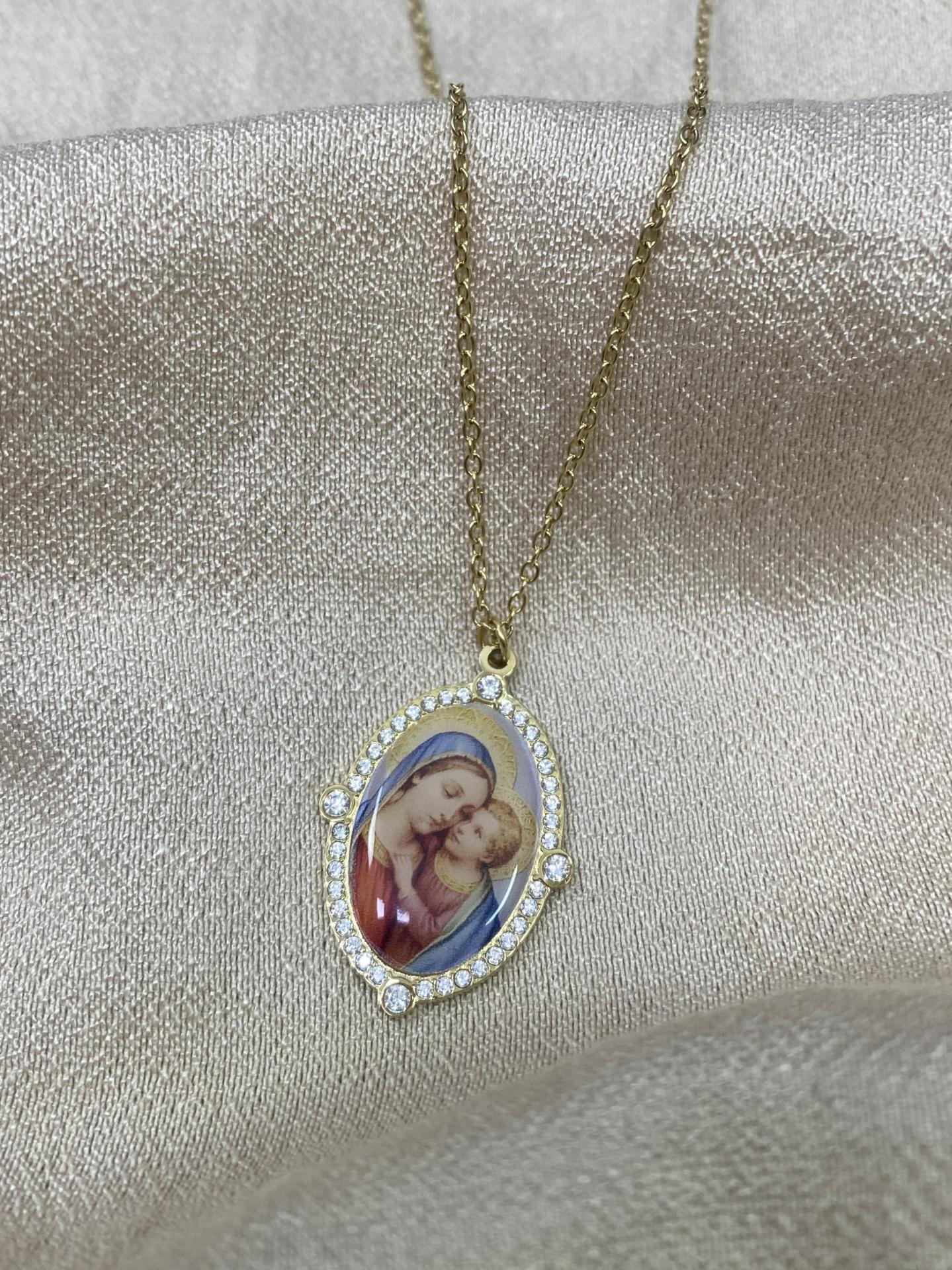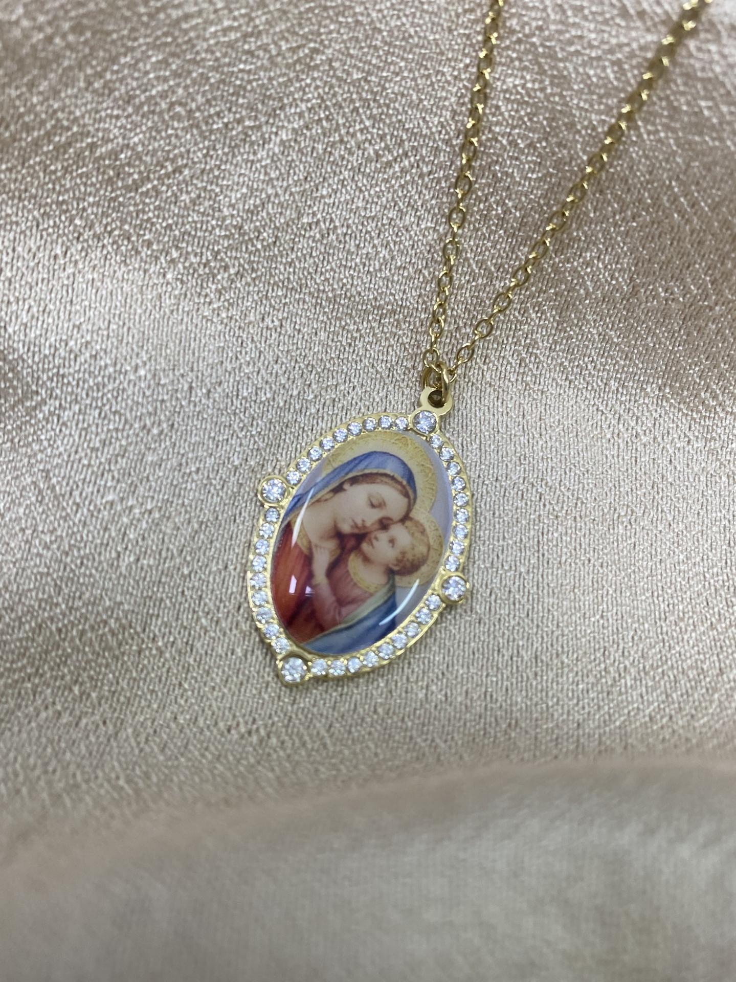 Este collar de acero inoxidable con colgante de la Virgen combina fe, elegancia y durabilidad. Su diseño ovalado con imagen de la Virgen aporta un toque espiritual y sofisticado, mientras que el contorno con brillo realza la pieza sin resultar recargada.