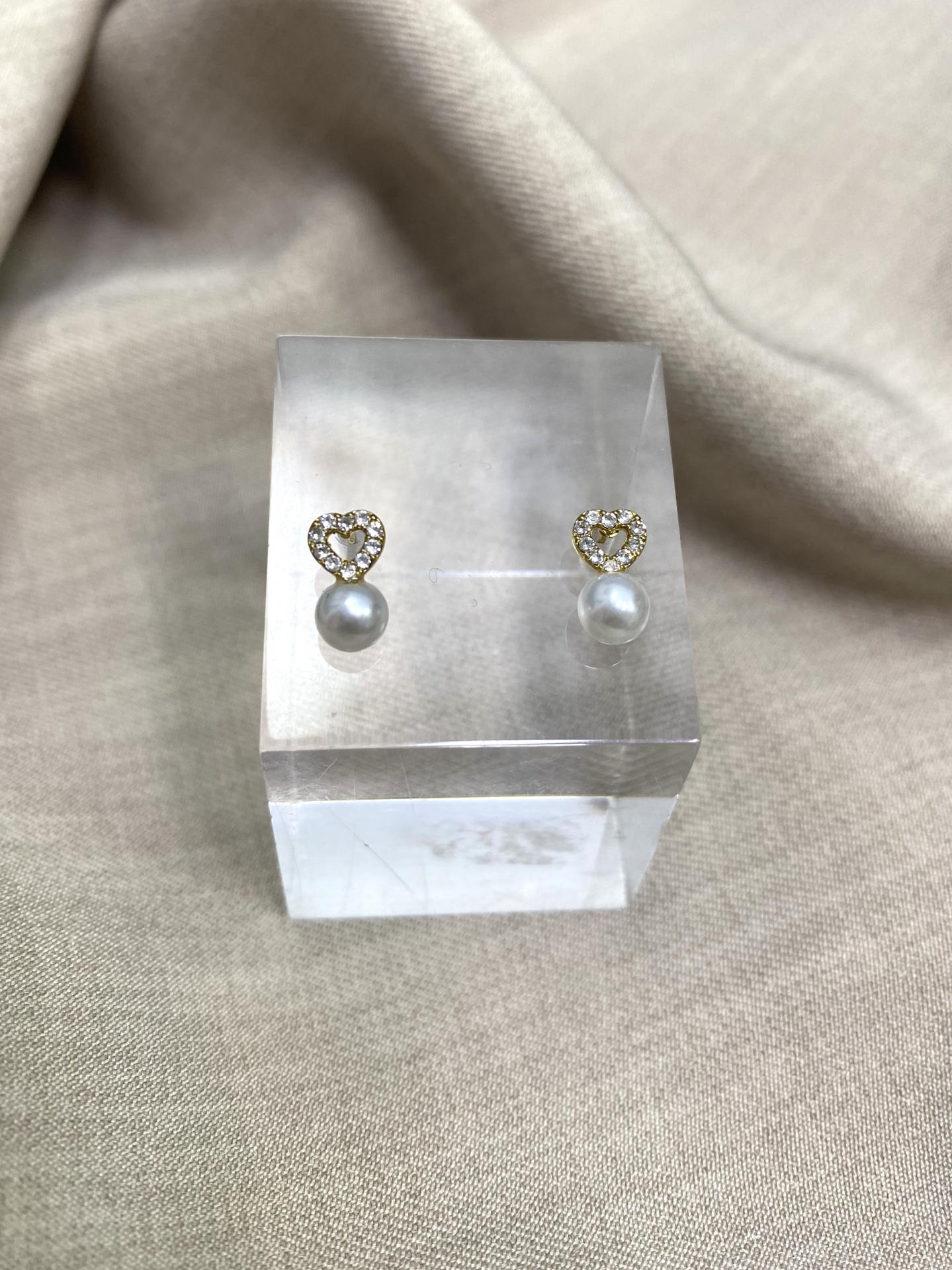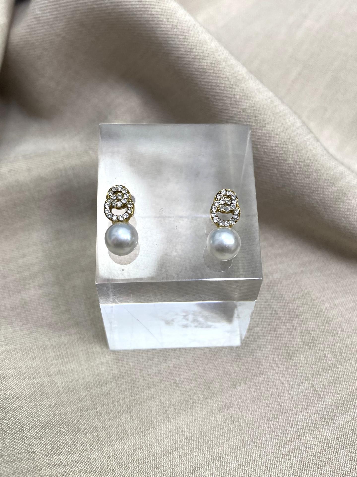 Pendientes de cierre de tuerca en acero dorado con brillantes y perla.