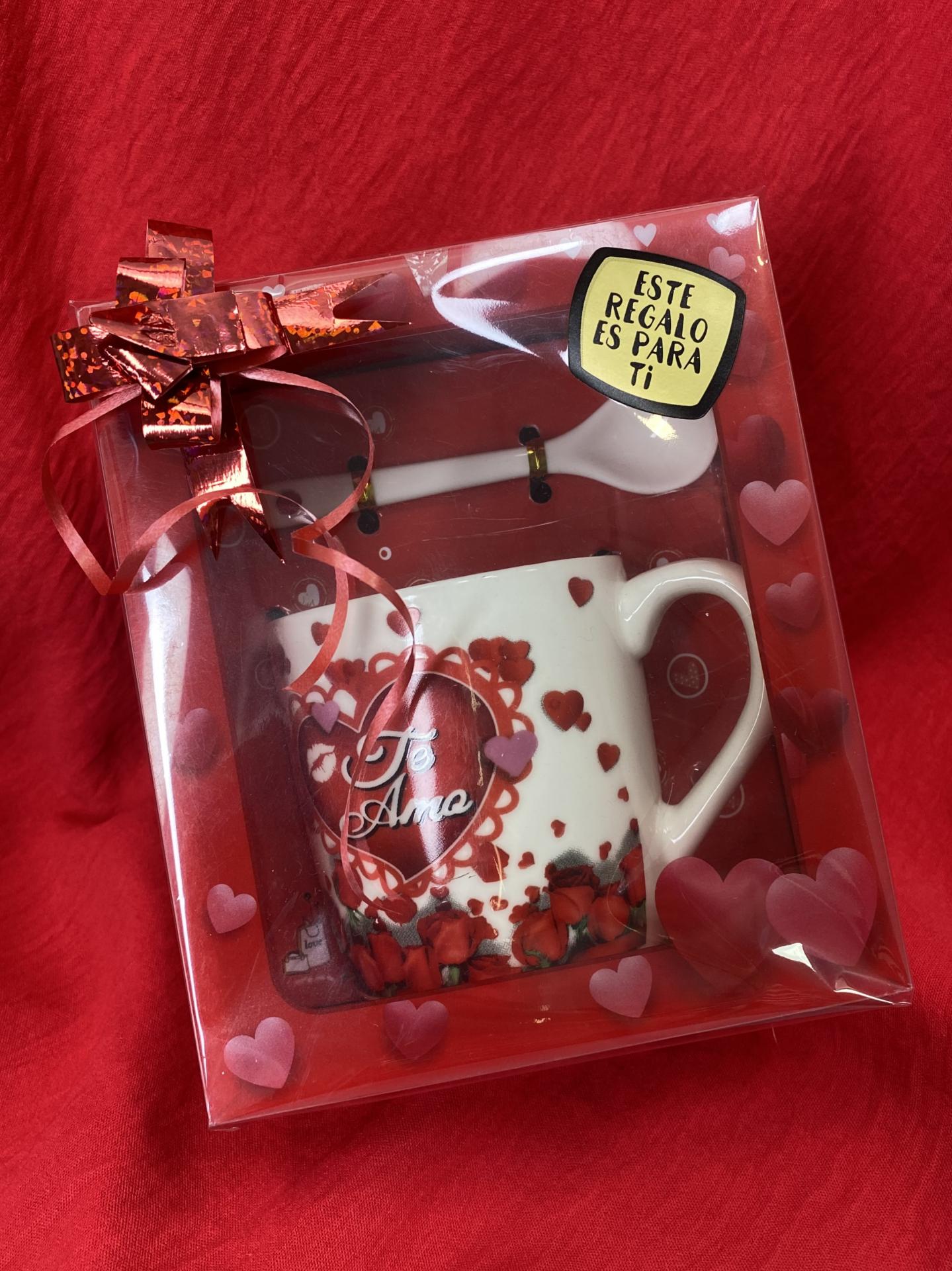 La taza está decorada con corazones y la frase “Te amo”, acompañada de una cuchara a juego, creando un conjunto romántico y funcional. Viene presentada en una caja roja decorada con corazones, y además envuelta en bolsa de plástico transparente con lazo, completamente empaquetada y lista para regalar, sin necesidad de añadir nada más.