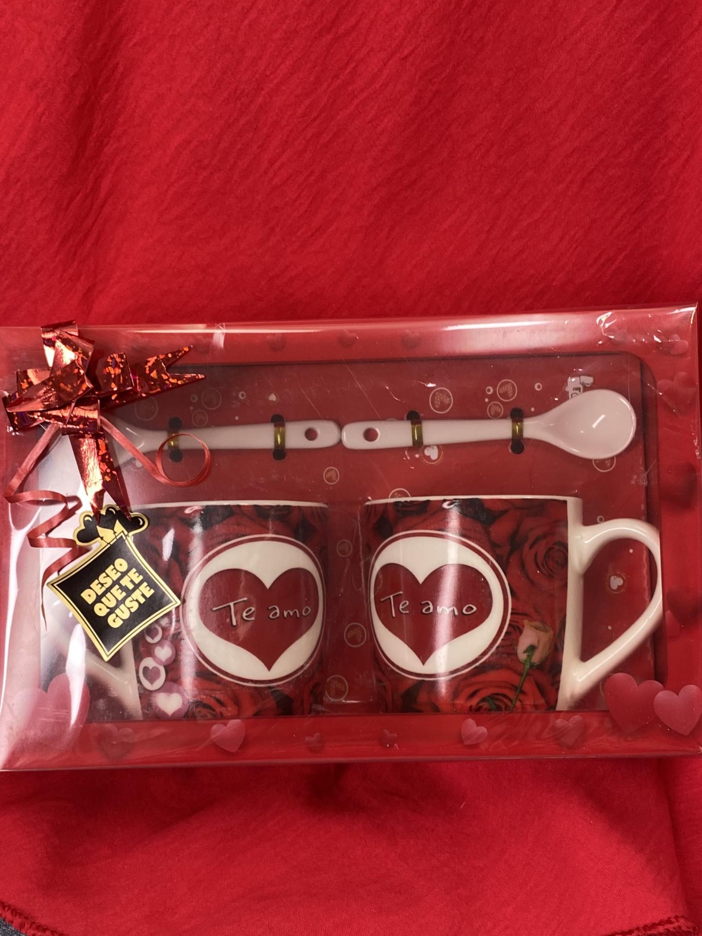 Incluye dos tazas con el mensaje “Te amo” y dos cucharas a juego, creando un conjunto armonioso, práctico y lleno de simbolismo. El pack viene presentado en una caja roja decorada con corazones, y además embolsado en bolsa transparente con lazo, completamente empaquetado y listo para regalar.