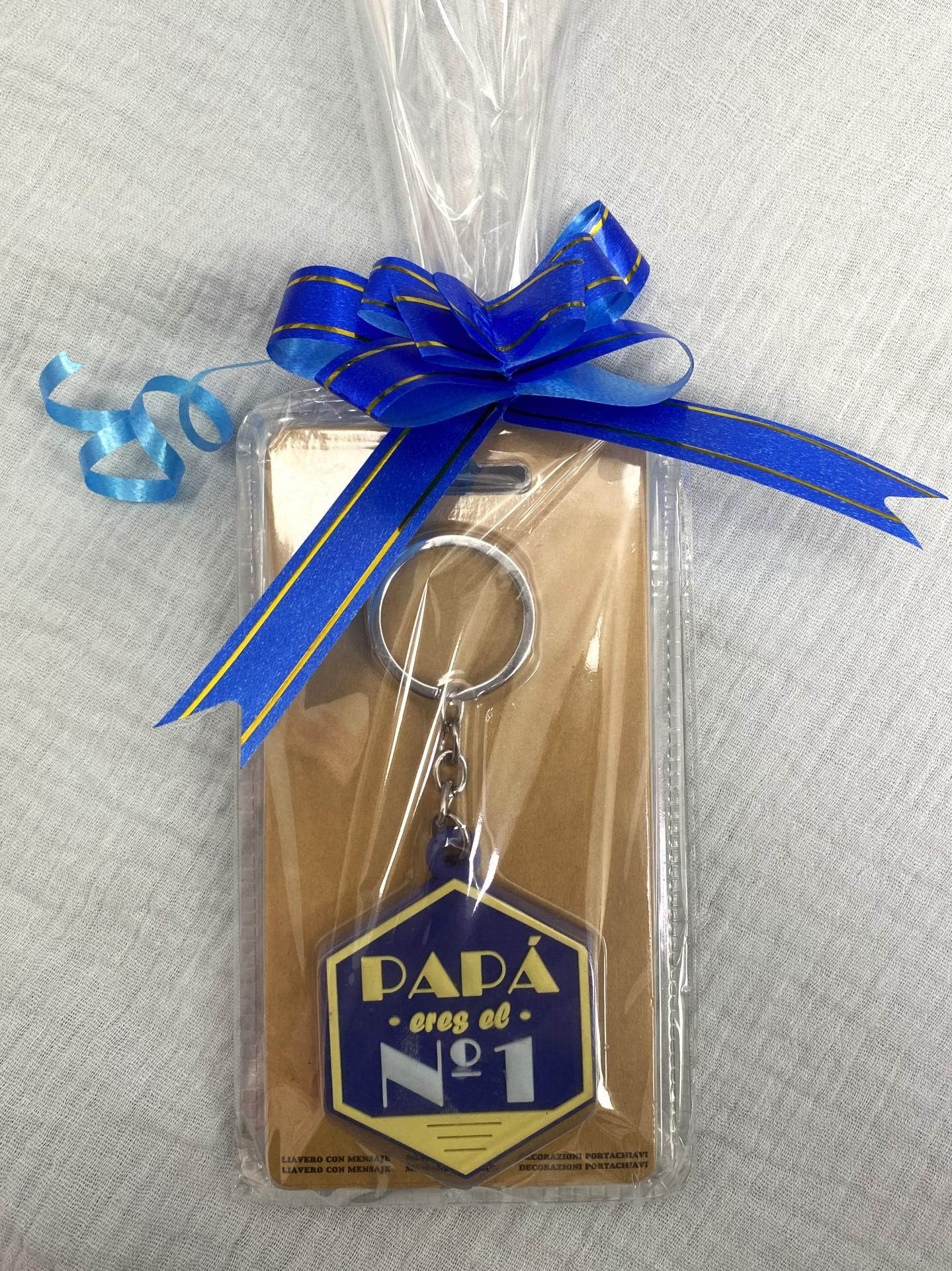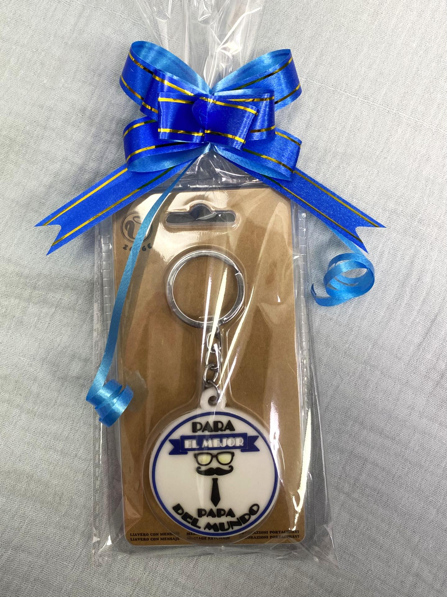 Sorprende a papá con un llavero especial, presentado en bolsita transparente con lazo azul decorativo y listo para regalar. Disponible en varios modelos con mensajes únicos para cada tipo de padre.