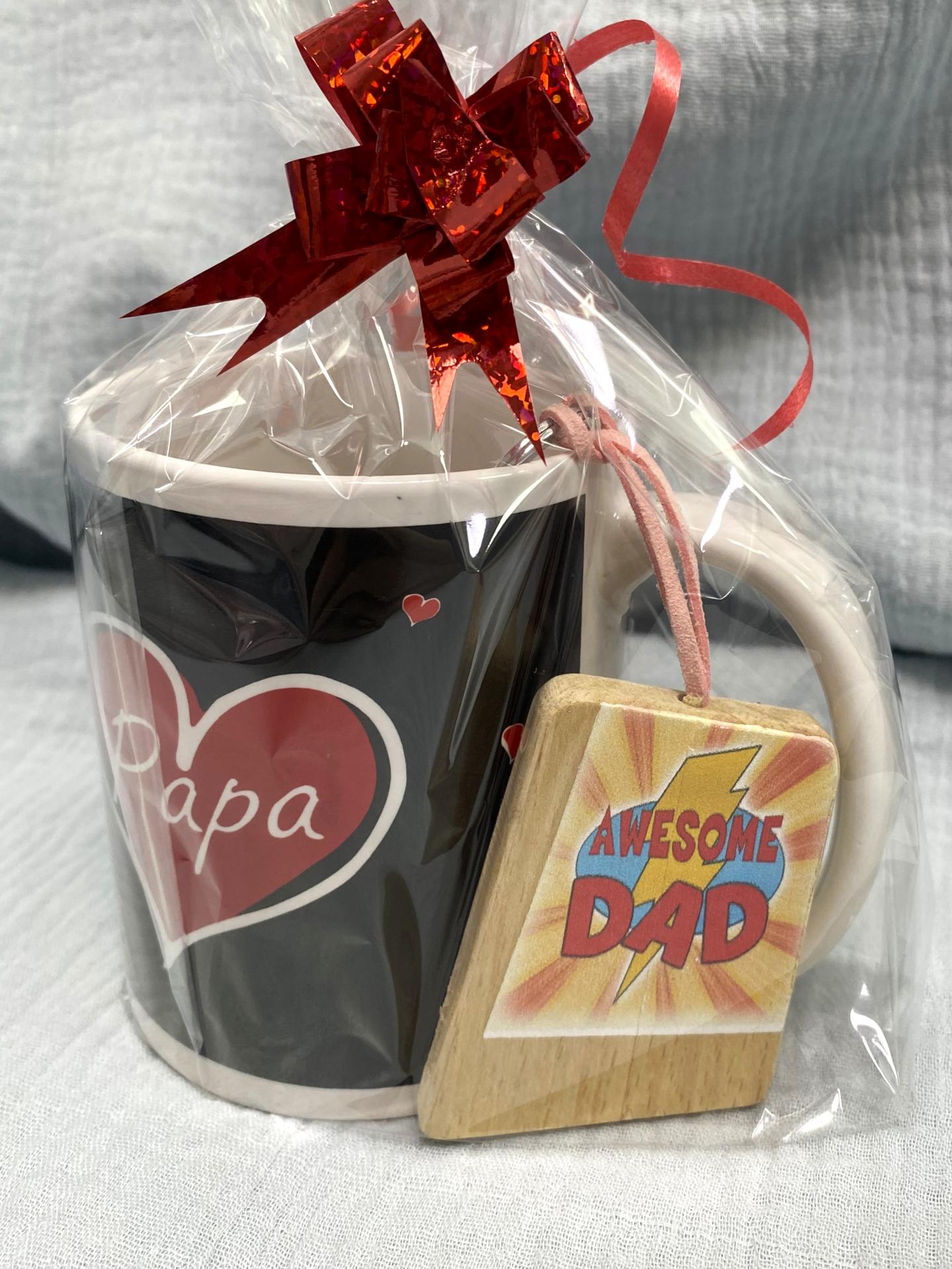 Este pack de regalo para el Día del Padre incluye una elegante taza negra con corazón rojo y mensaje “Papá”, acompañada de un llavero de madera con diseño “Awesome Dad”. Una combinación perfecta entre ternura y personalidad, pensada para sorprenderle de verdad.