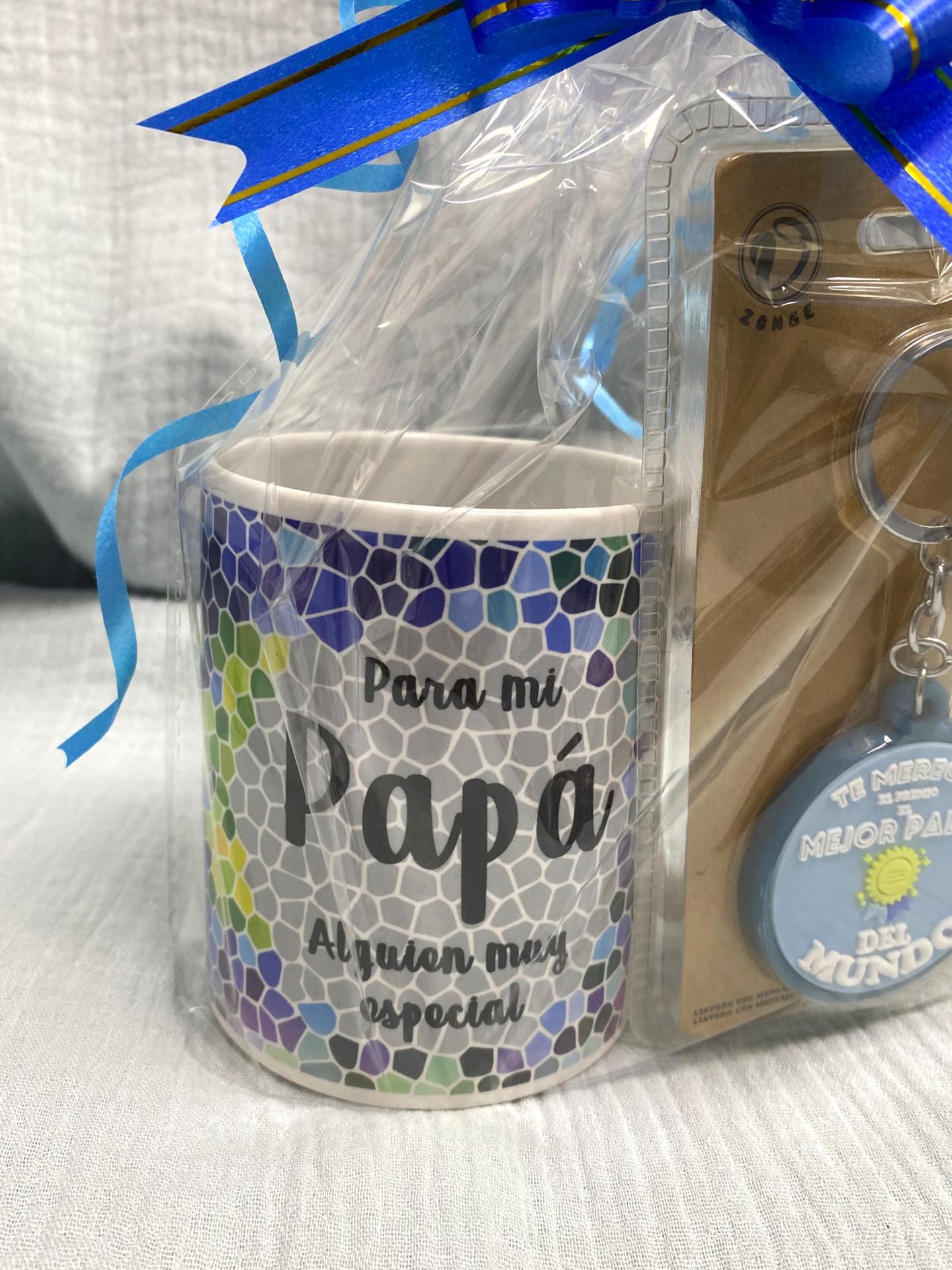 Este pack para el Día del Padre incluye una taza con el mensaje “Para mi papá, alguien muy especial” y un llavero azul con la frase “Te mereces el premio al mejor padre del mundo”.