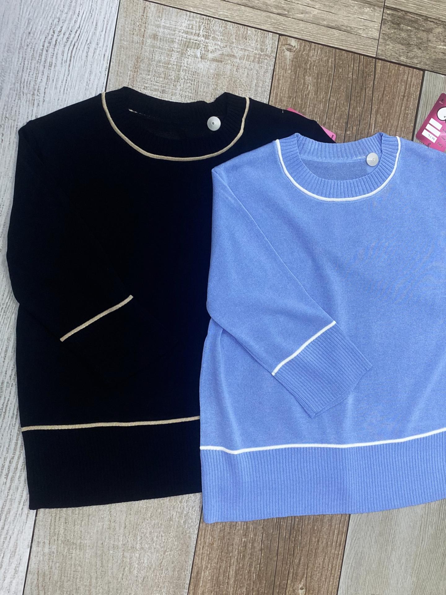 Jersey de punto fino para mujer con detalle bicolor en cuello, mangas y bajo. Disponible en beige, marrón, negro, azul y verde. Tallas M/L y L/XL.