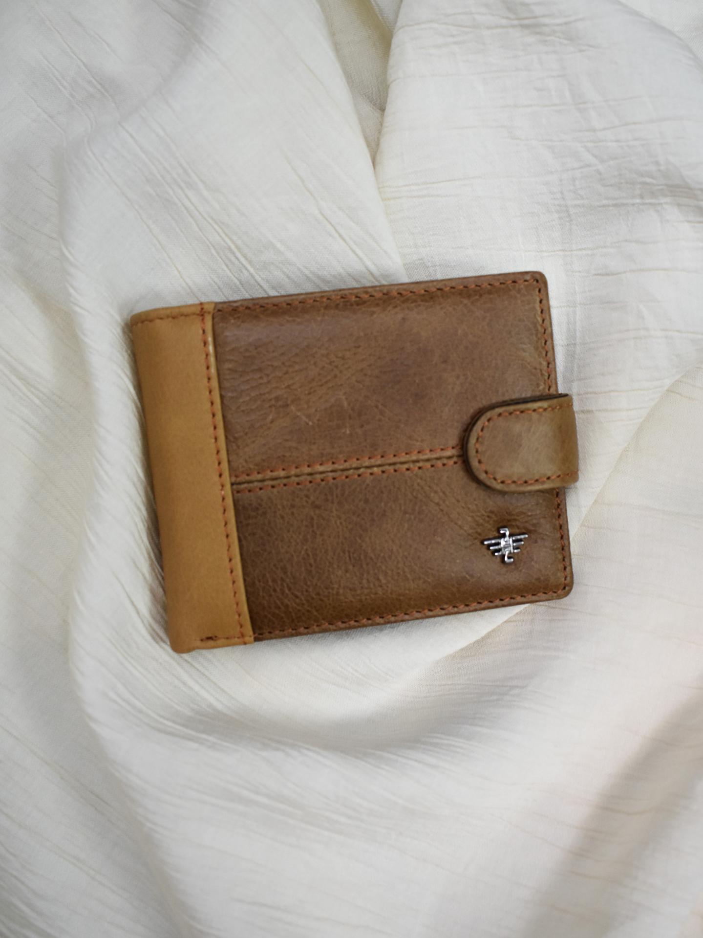 Cartera de hombre en piel auténtica con cierre de botón. Compacta, elegante y funcional. Disponible en negro, marrón oscuro y camel.