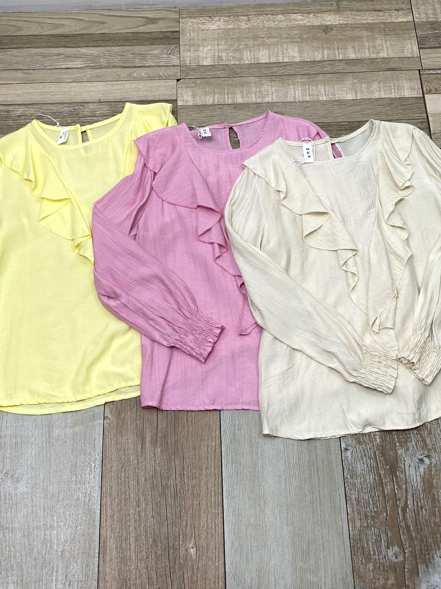 Blusa elegante para mujer con volantes y manga larga. Disponible en colores beige, rosa y amarillo.