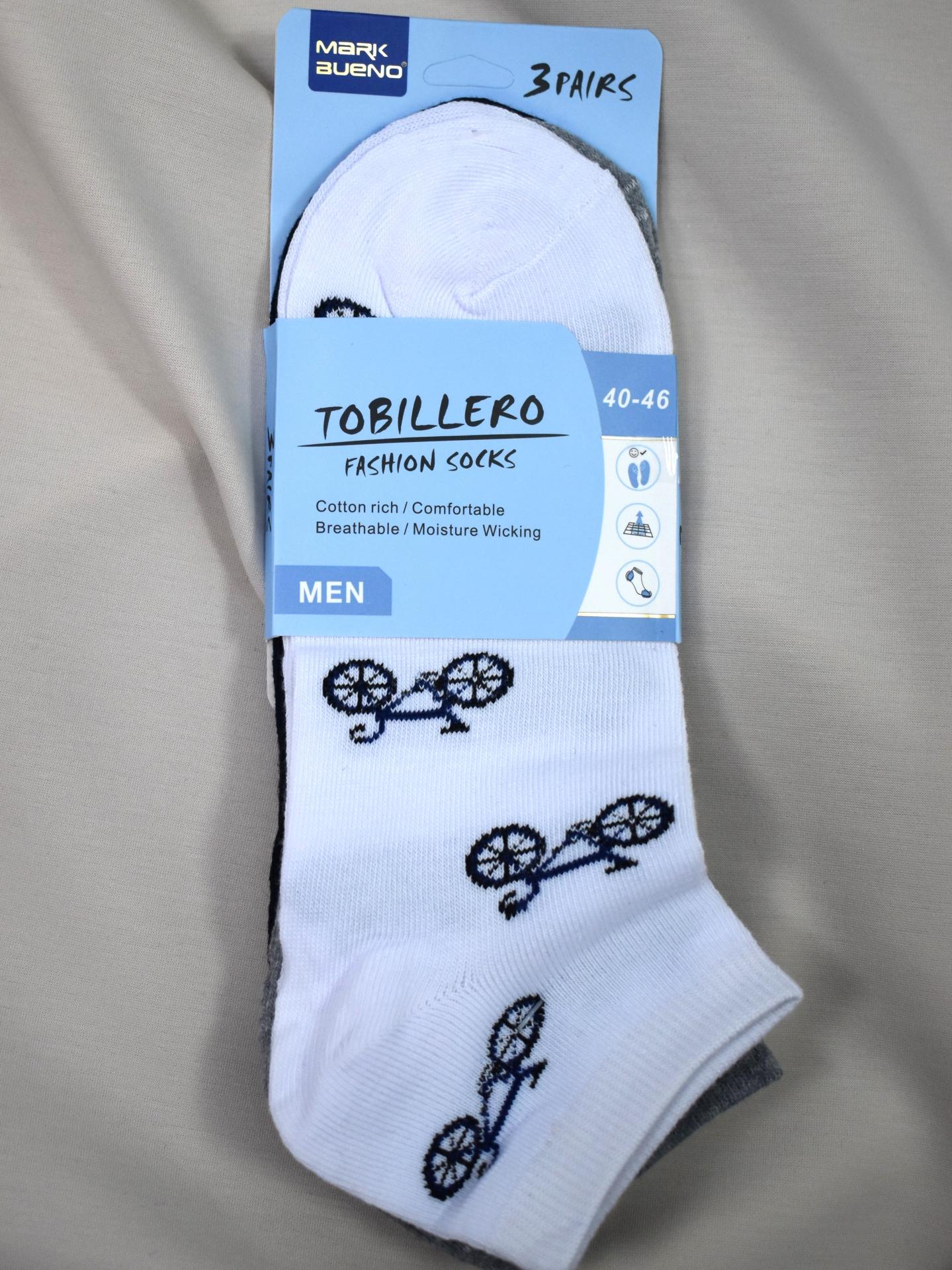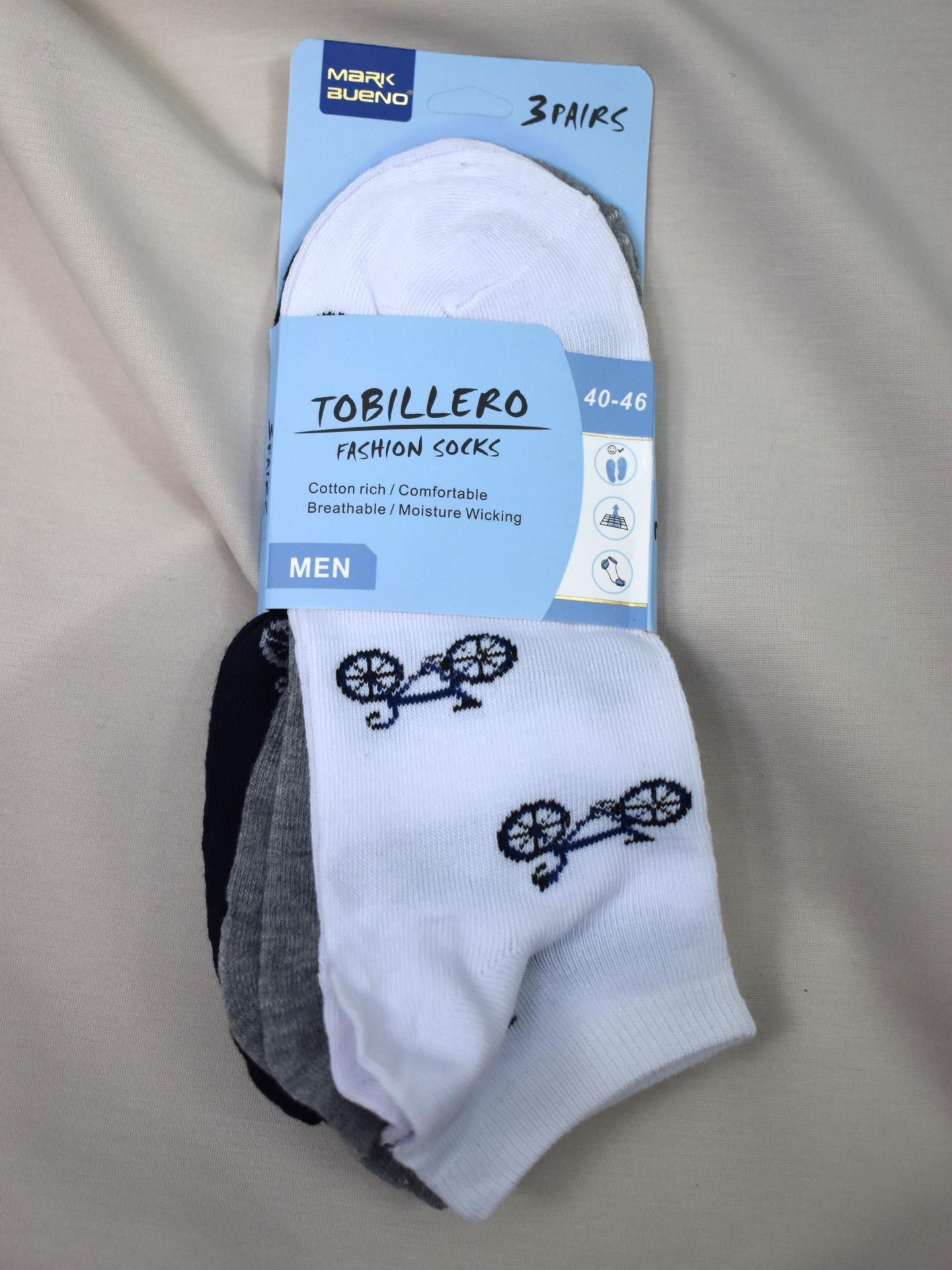 Pack de 3 calcetines cortos para hombre con diseño de bicicleta. Fabricados en algodón, cómodos, transpirables y talla 40-46.