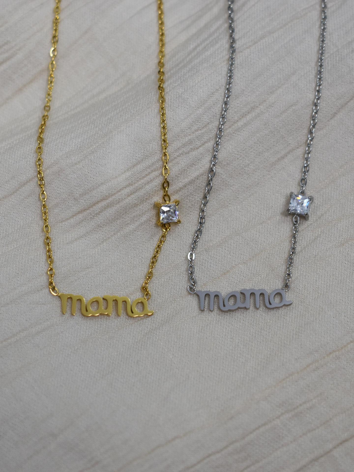 El diseño incluye la palabra “mamá” integrada en el colgante, acompañada de una pequeña piedra brillante que aporta un toque de elegancia y luminosidad. Este detalle convierte el collar en una pieza sencilla pero muy especial, ideal para llevar todos los días.