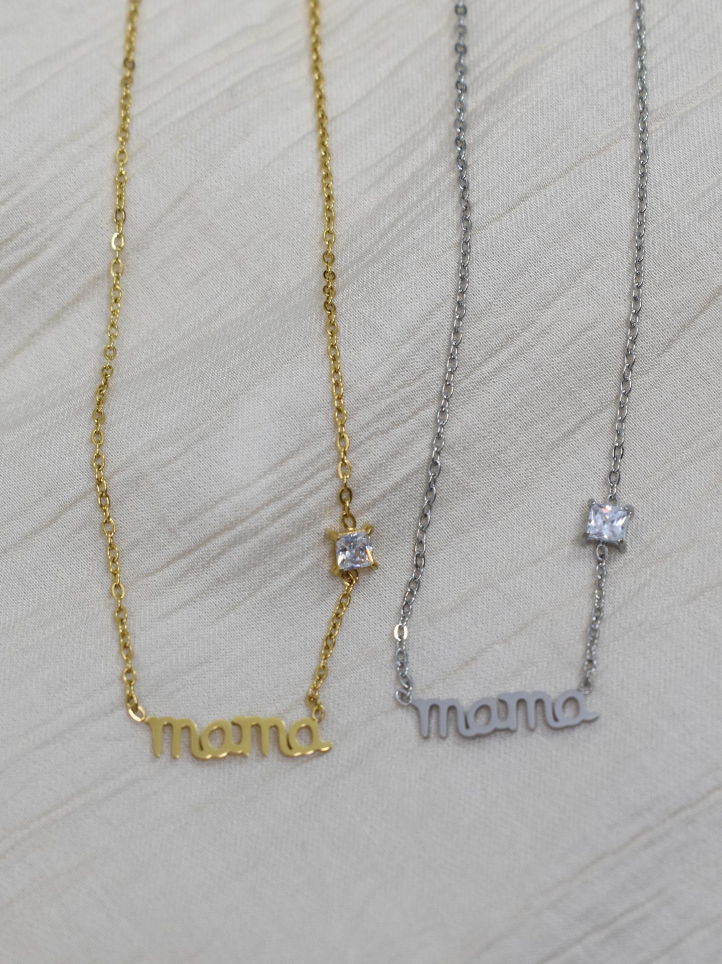 Elegante collar Mamá de acero inoxidable disponible en color dorado y plateado, con cadena ajustable y detalle de piedra brillante. Un regalo original para el Día de la Madre, perfecto para sorprender a mamá con un detalle delicado y lleno de significado.