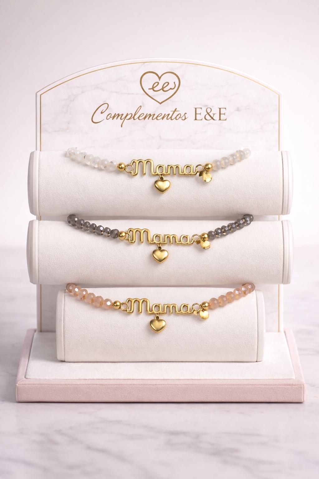 La pulsera está formada por pequeños cristales brillantes que aportan un toque sofisticado y moderno. En el centro destaca la palabra “Mamá” en acero inoxidable, acompañada de un pequeño colgante en forma de corazón, un símbolo universal de amor y cariño.