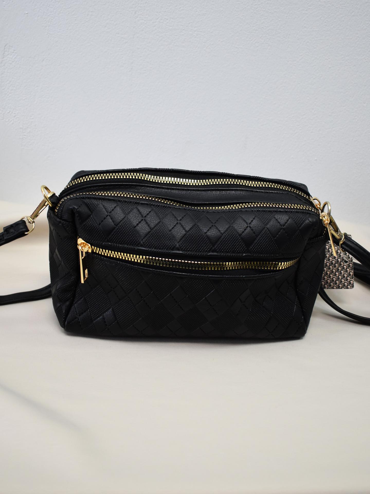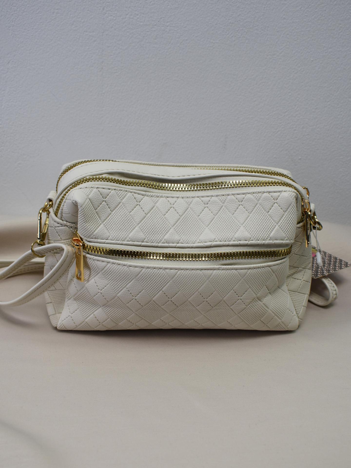 Bolso bandolera pequeño pero amplio, con múltiples compartimentos y cremallera. Diseño moderno acolchado disponible en negro y blanco.