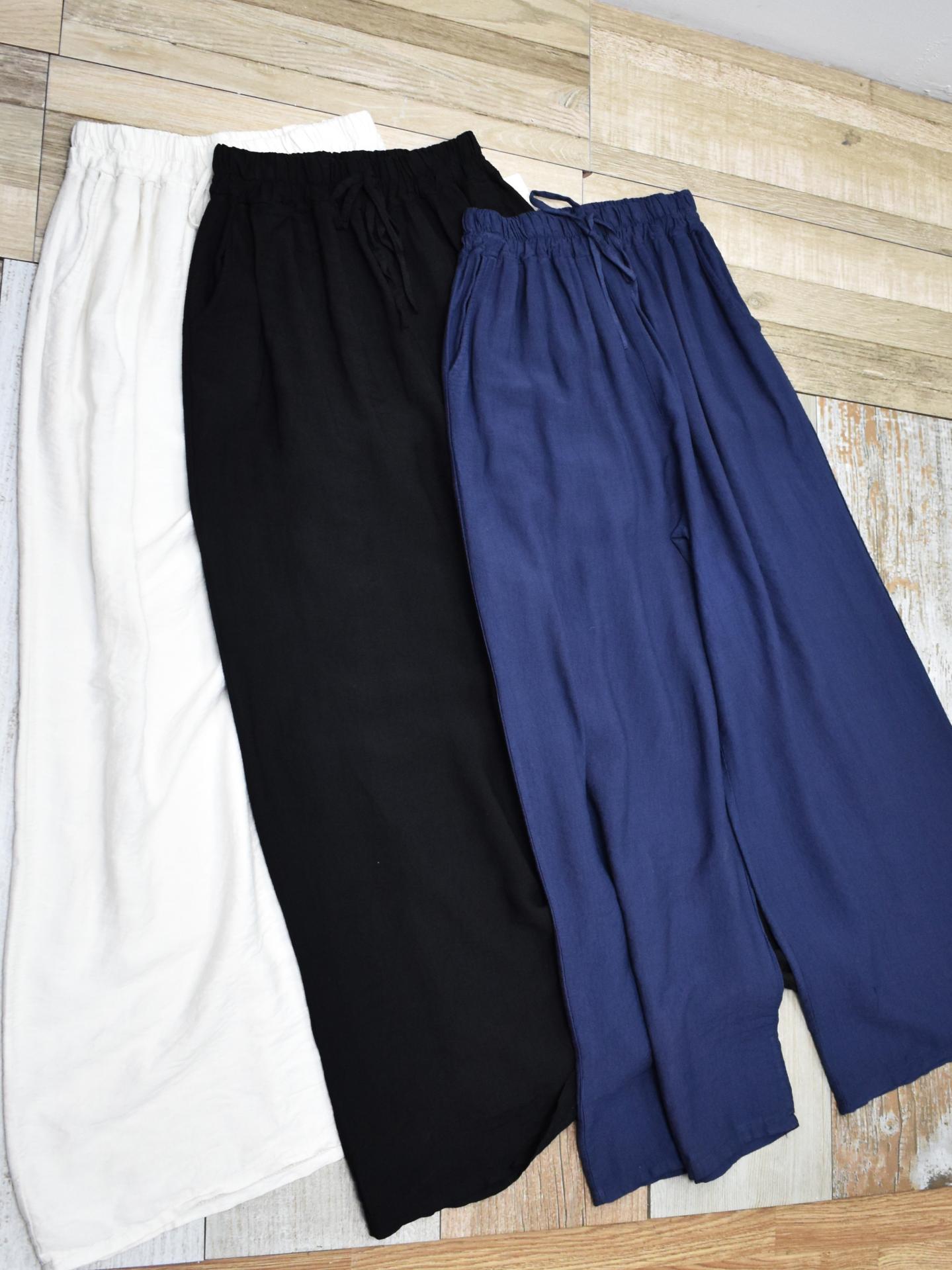 Pantalón curvy ancho con cintura elástica de goma, tejido ligero y fluido. Disponible en blanco, negro y azul. Ideal para looks cómodos, frescos y versátiles.