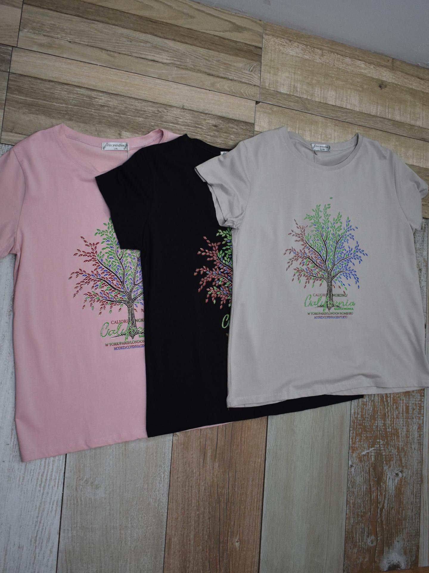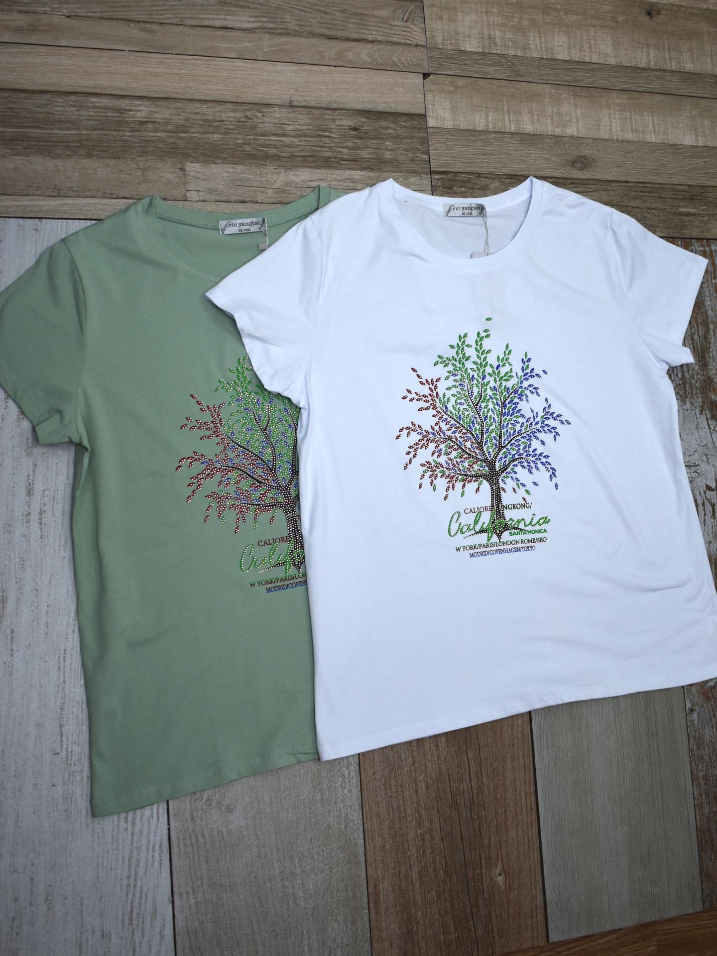 Camiseta curvy de manga corta con estampado de árbol multicolor, tejido suave y cómodo. Disponible en 5 colores y tallas L/XL y XXL/XXXL. Ideal para looks casuales con estilo.