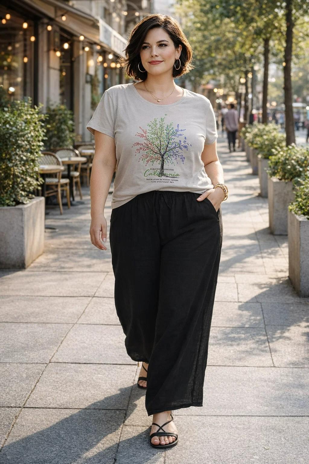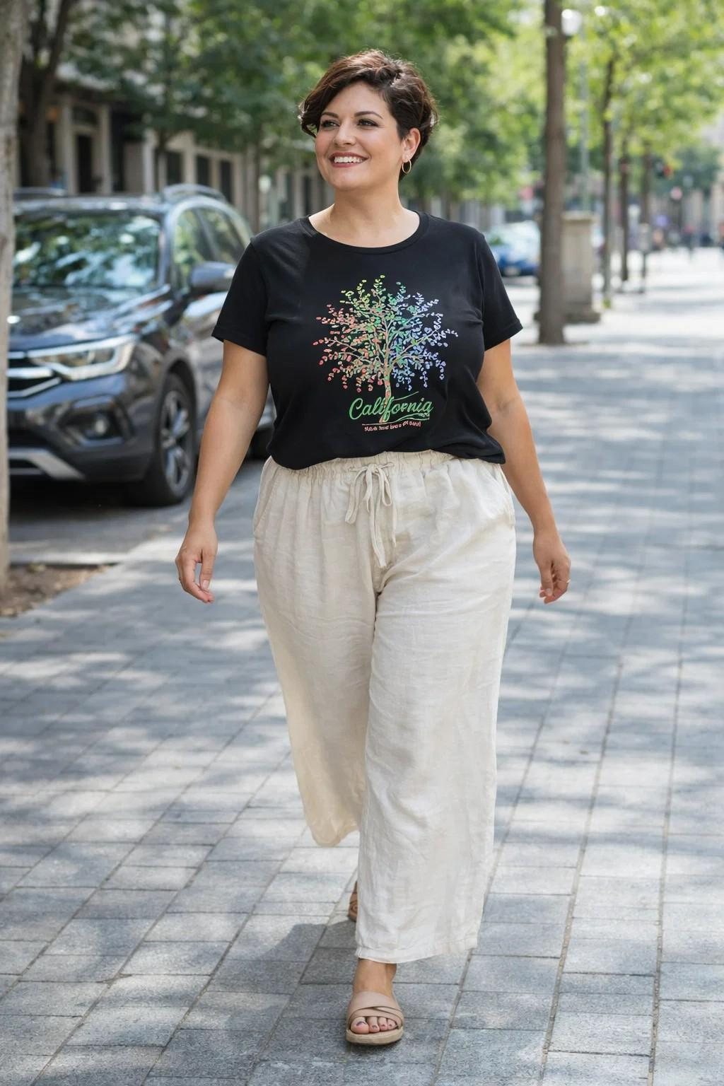 Renueva tu armario con esta camiseta curvy de manga corta con estampado de árbol multicolor, una prenda diseñada para ofrecer comodidad, estilo y personalidad en cada look.