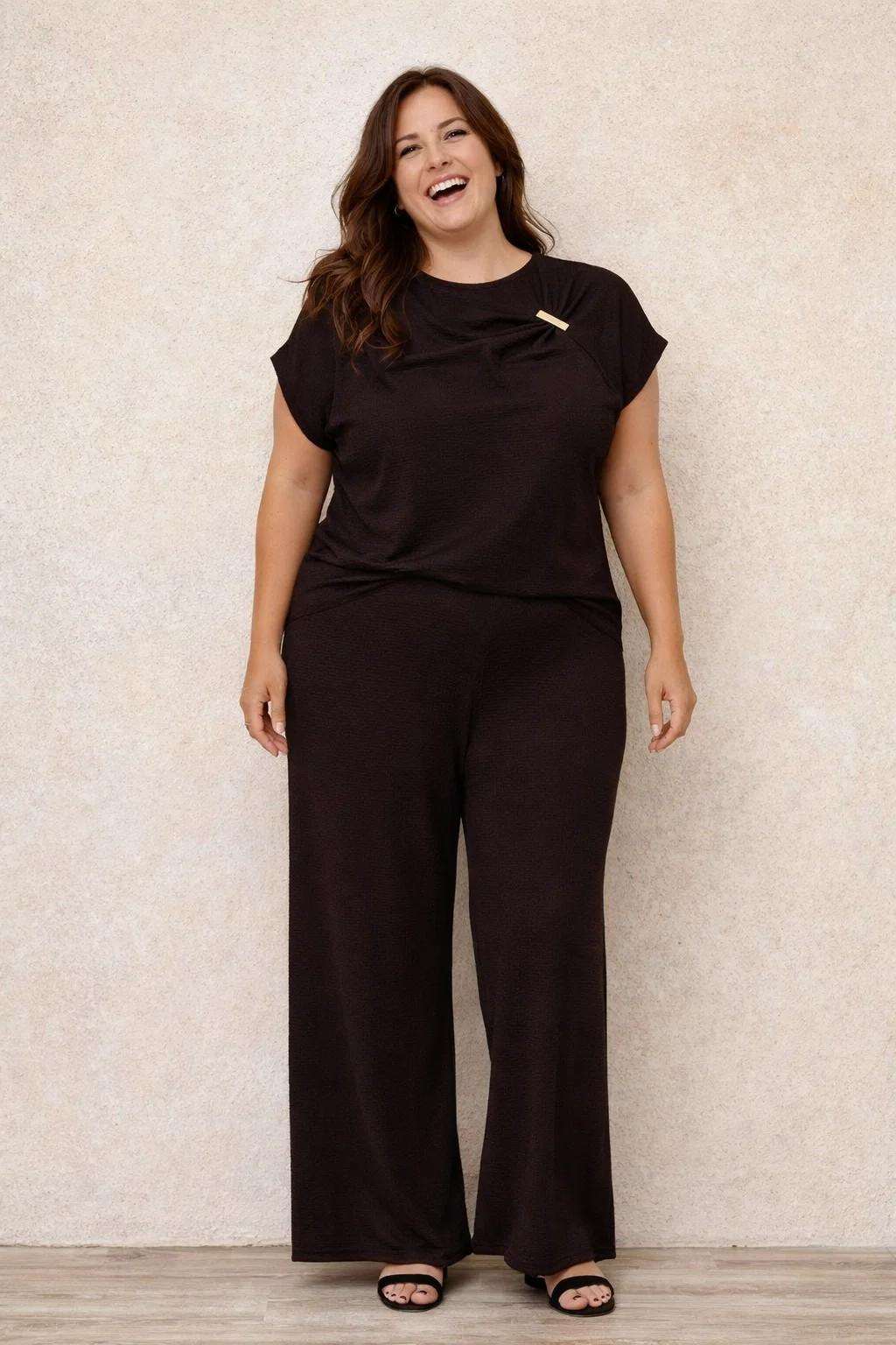 Conjunto mujer curvy elegante de dos piezas, tejido elástico, cómodo y sofisticado. Disponible en marrón chocolate y negro.