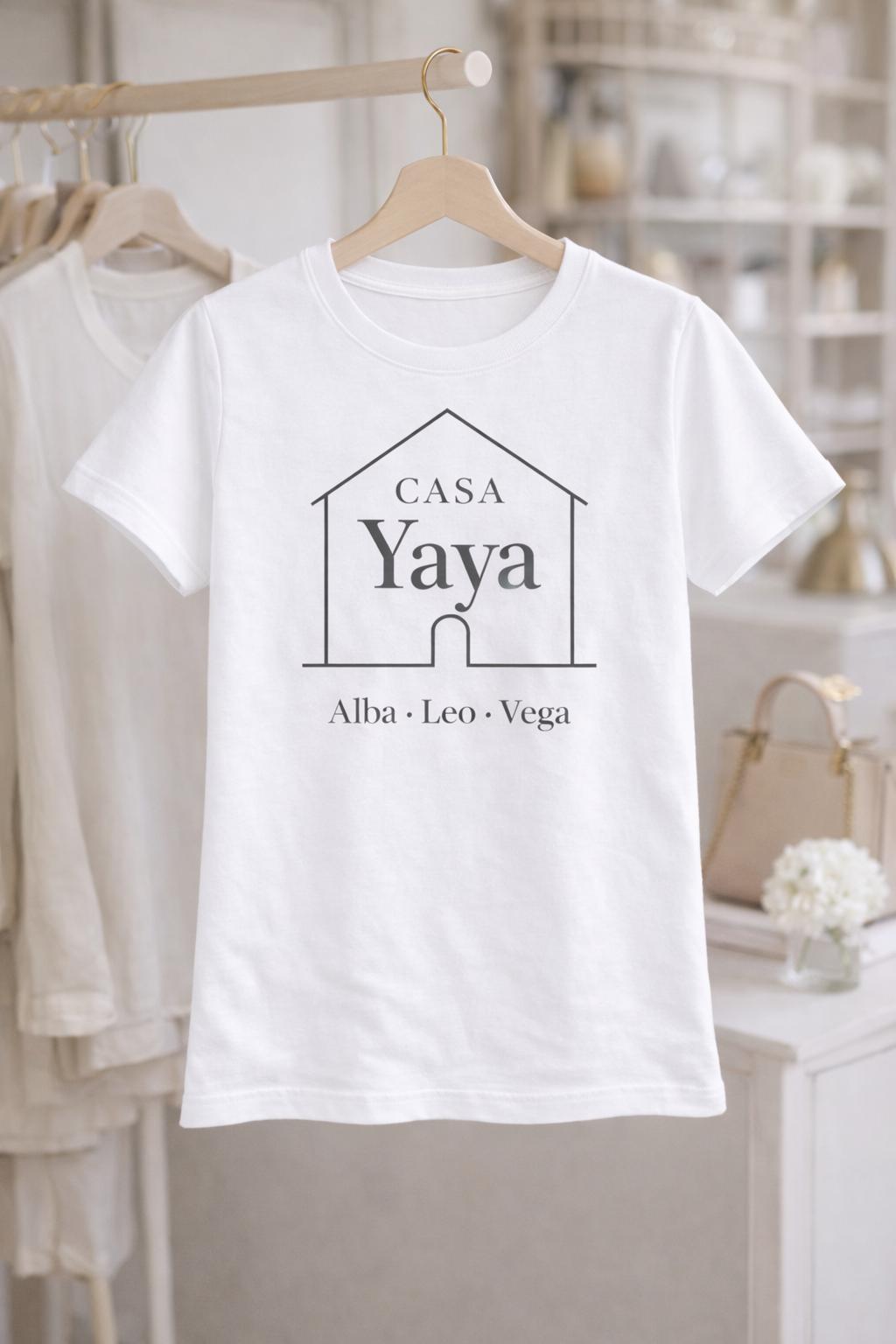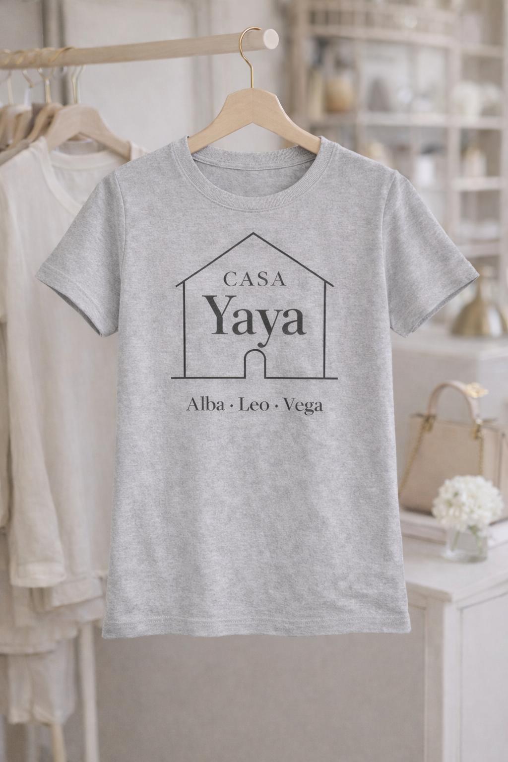 Camiseta para yaya personalizada con diseño Casa Yaya y nombres de los nietos. Un regalo original para abuela, emotivo, elegante y perfecto para sorprender con un detalle especial que recordará siempre.