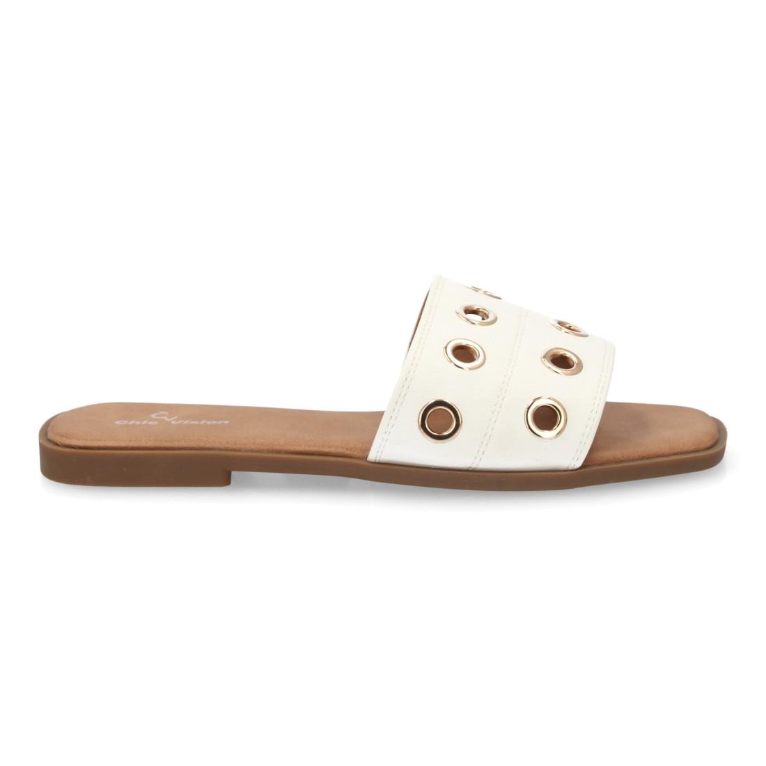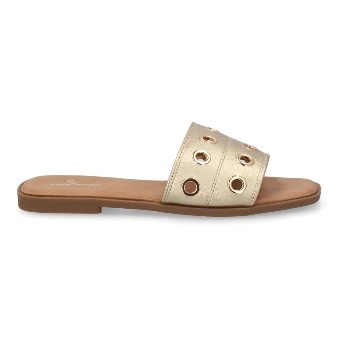 Sandalias planas mujer con ojales metálicos dorados, cómodas y modernas. Diseño minimalista ideal para verano. Disponibles en varios colores.