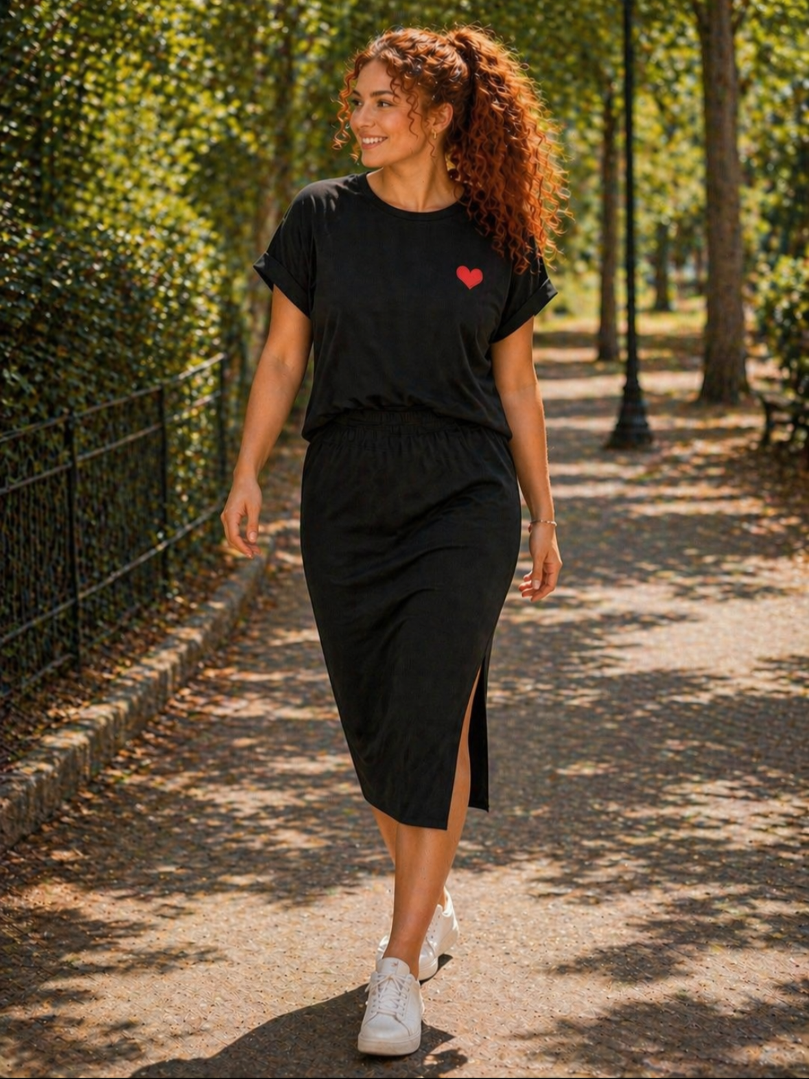 La camiseta tiene una caída relajada que sienta muy bien, y la falda con cintura elástica acompaña sin apretar, algo que siempre valoro cuando quiero recomendar una prenda que resulte práctica de verdad. Además, la abertura lateral aporta movimiento y hace que el conjunto se vea más actual y estiloso.